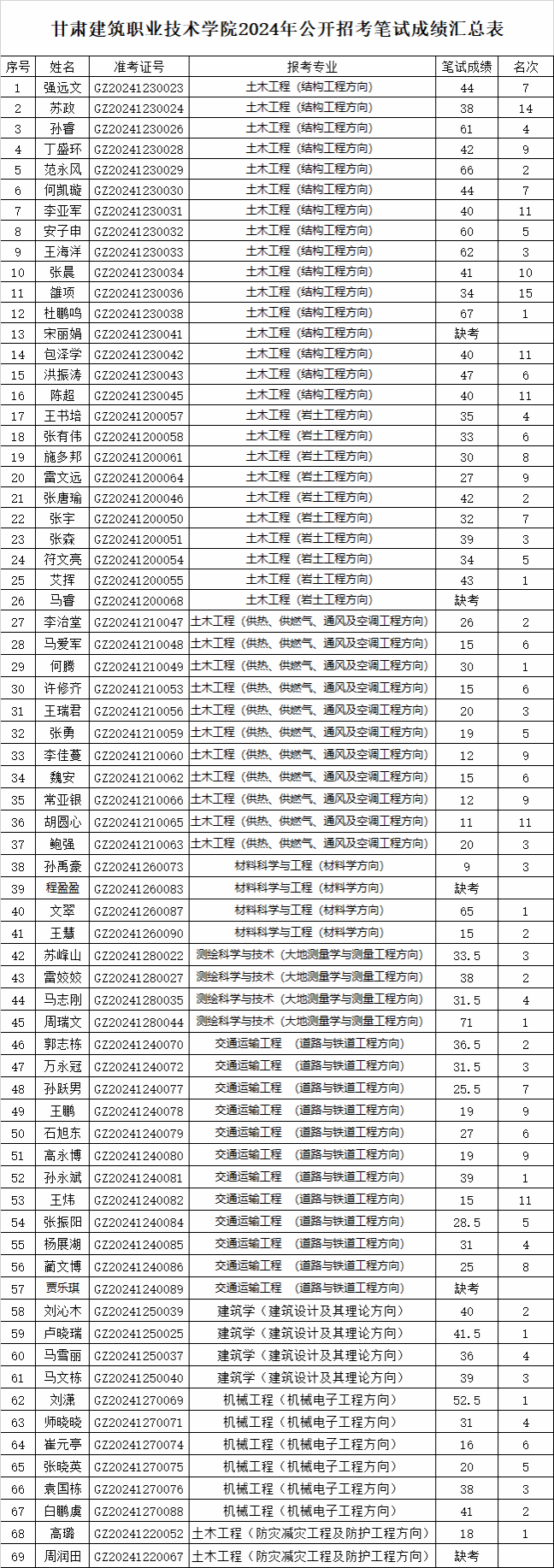 甘肃建筑职业技术学院2024年公开招聘笔试成绩公示 日期:2024-06-19 来源: 我院2024年面向社会公开招聘事业编制专业技术人员10名。招聘笔试于2024年6月15日进行,现对笔试成绩面向全社会进行公示,接受监督。公示时间:2024年6月19日—25日公示方式:网络公示监督电话:0931-2394169甘肃建筑职业技术学院2024年6月19日 附件【甘肃建筑职业技术学院2024年公开招考笔试成绩汇总表.xlsx】已下载次
