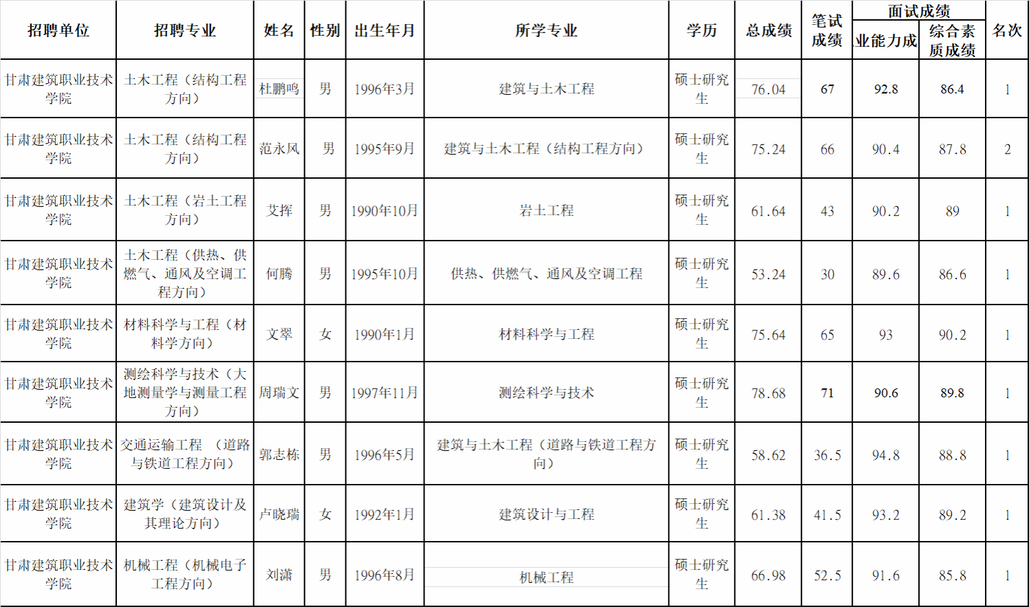 甘肃建筑职业技术学院2024年公开招聘拟聘人员公示表