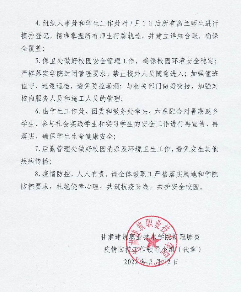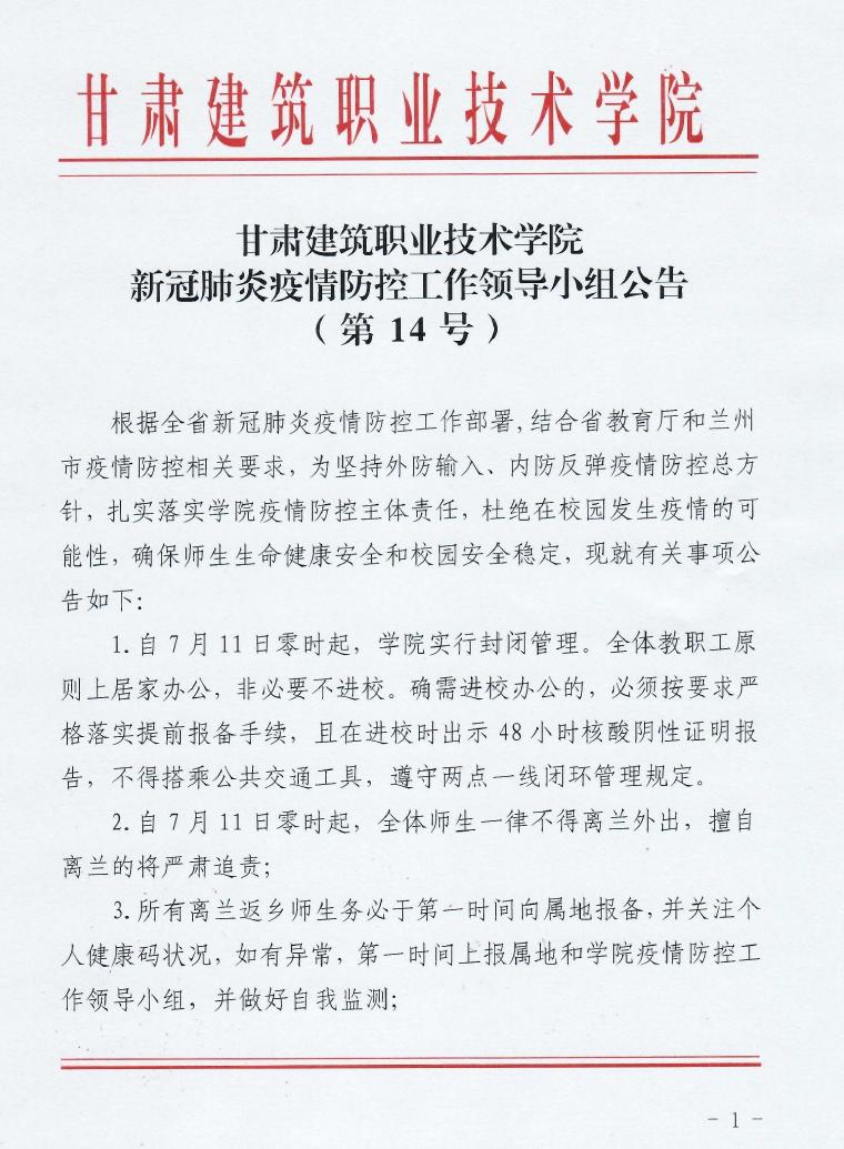 甘肃建筑职业技术学院新冠肺炎疫情防控工作领导小组公告(第14号)
