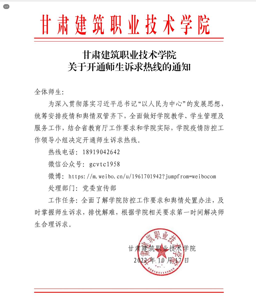 甘肃建筑职业技术学院关于开通师生诉求热线的通知
