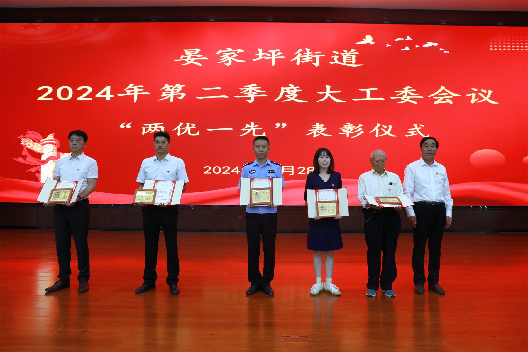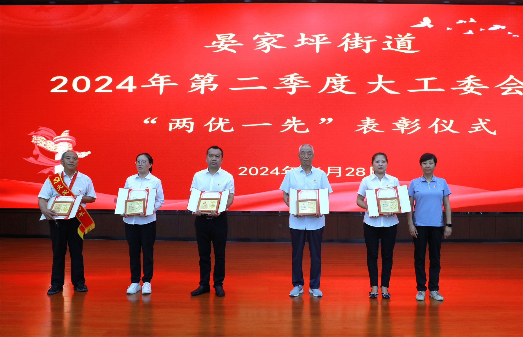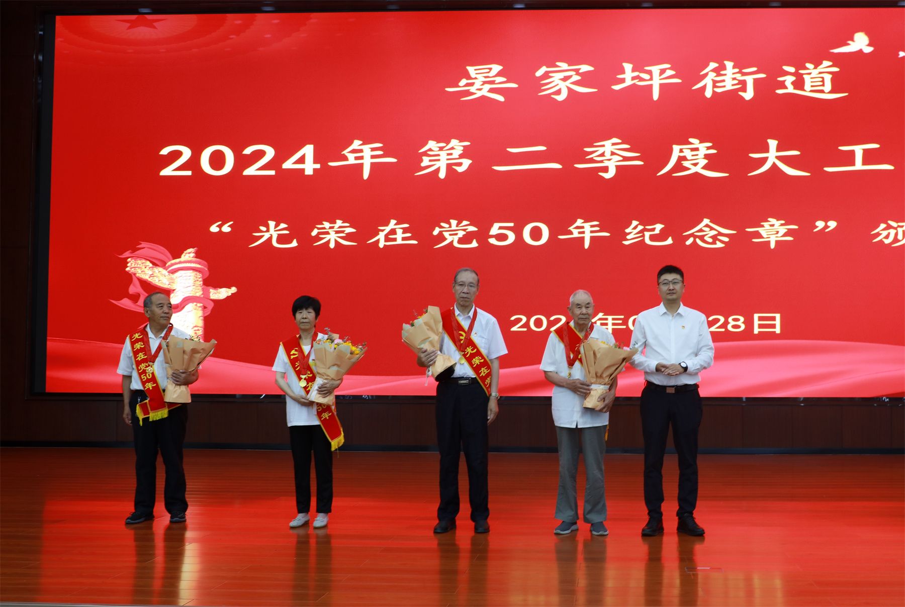 会上,街道党工委书记张恩辉向4位老党员颁发了“光荣在党50年纪念章”。并进行了“两优一先”表彰仪式。街道党工委副书记、政法委员许鸿翔同志宣读了《晏家坪街道关于表彰2023-2024年度优秀共产党员、优秀党务工作者、先进基层党组织的决定》。
