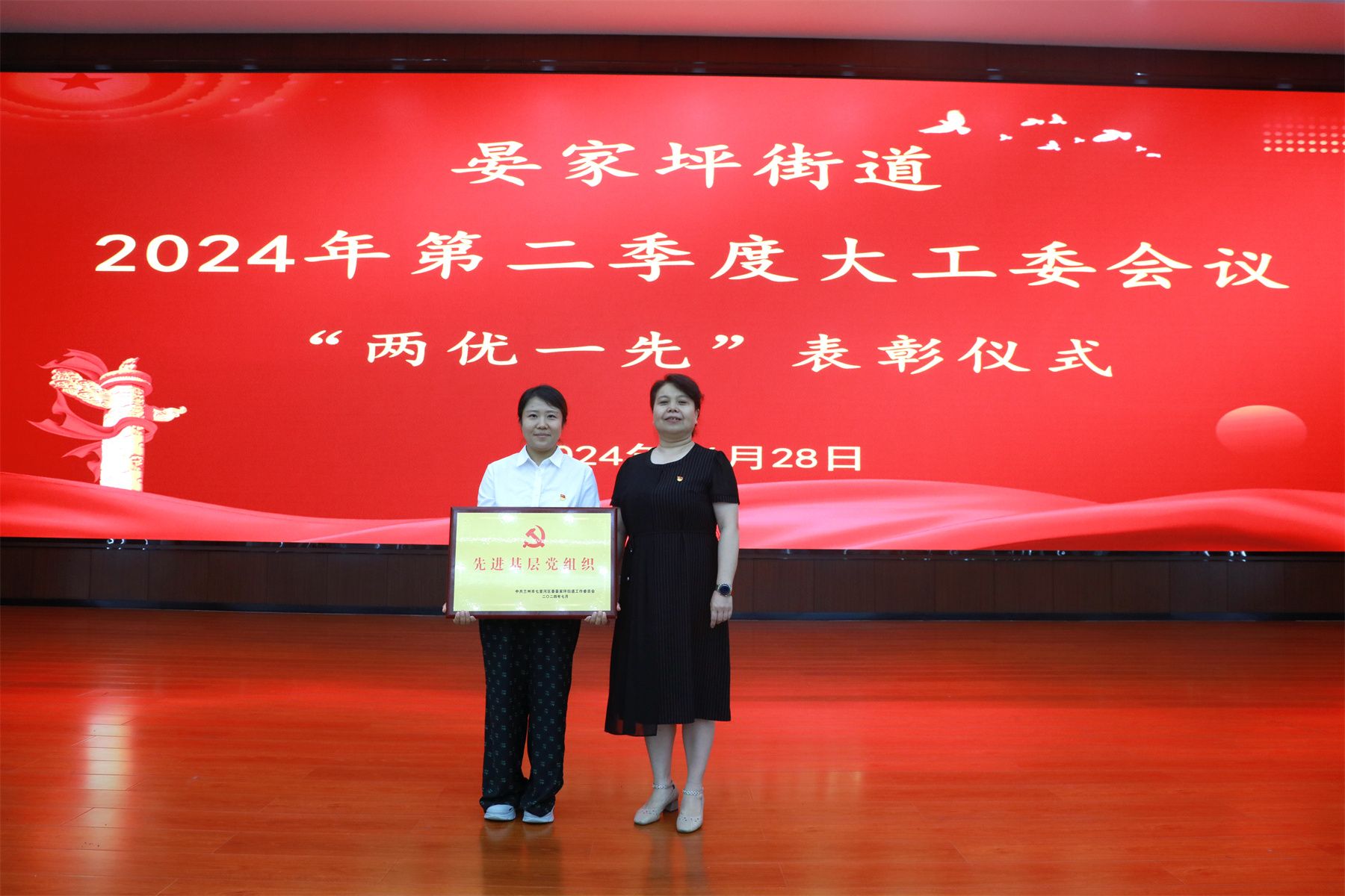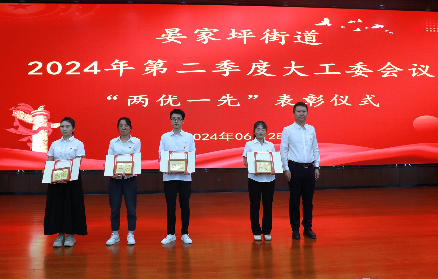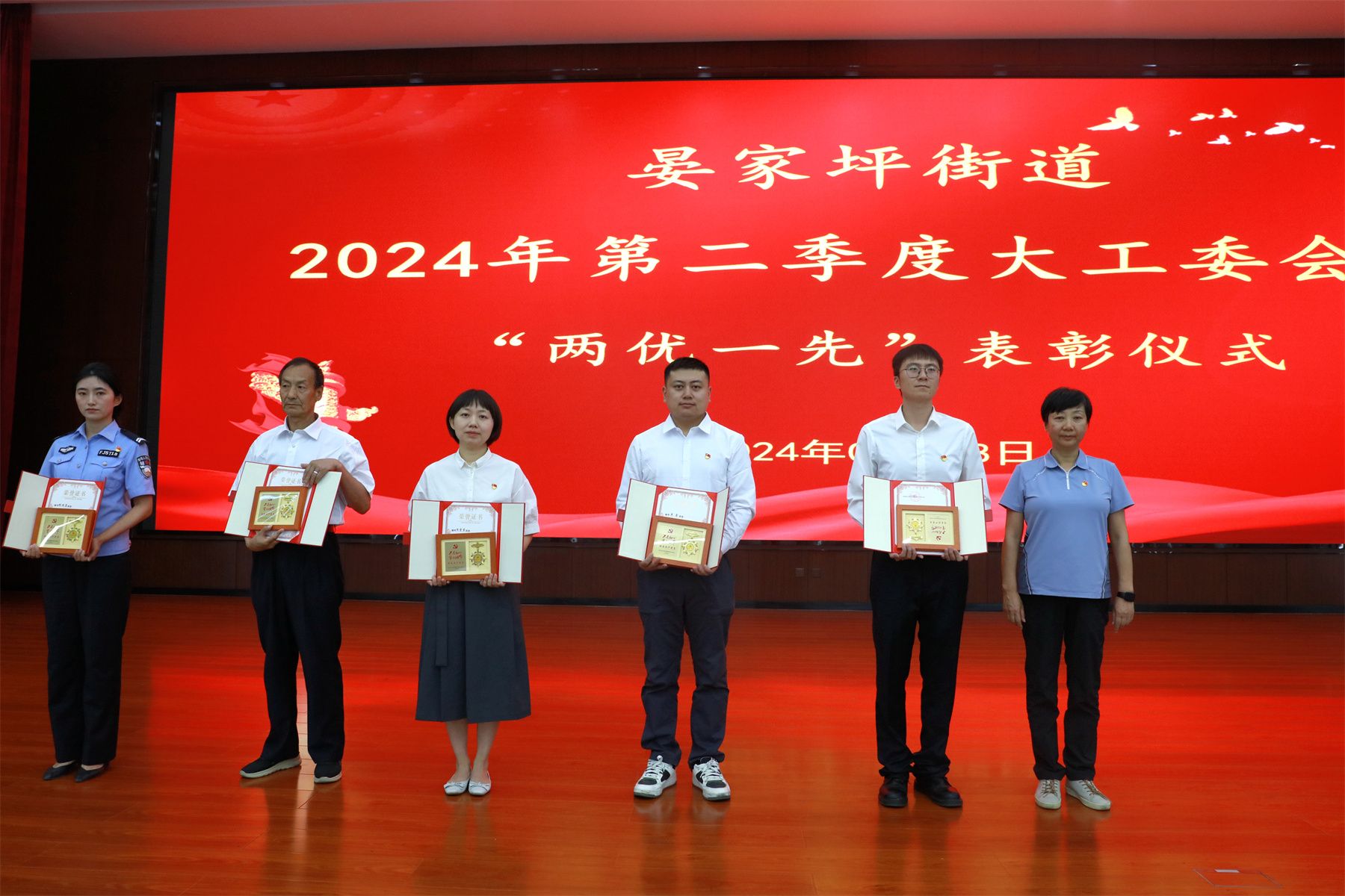 会上,街道党工委书记张恩辉向4位老党员颁发了“光荣在党50年纪念章”。并进行了“两优一先”表彰仪式。街道党工委副书记、政法委员许鸿翔同志宣读了《晏家坪街道关于表彰2023-2024年度优秀共产党员、优秀党务工作者、先进基层党组织的决定》。
