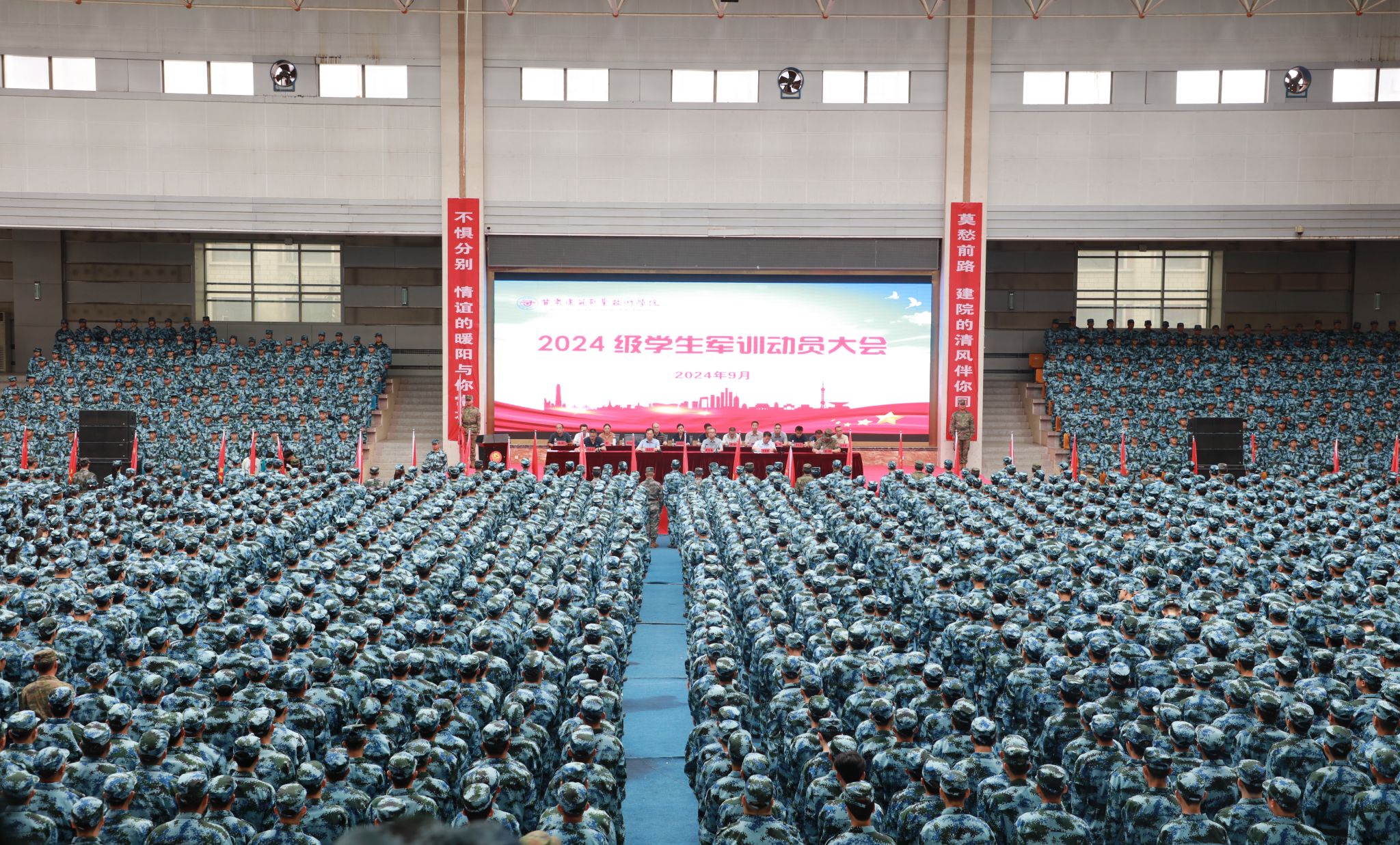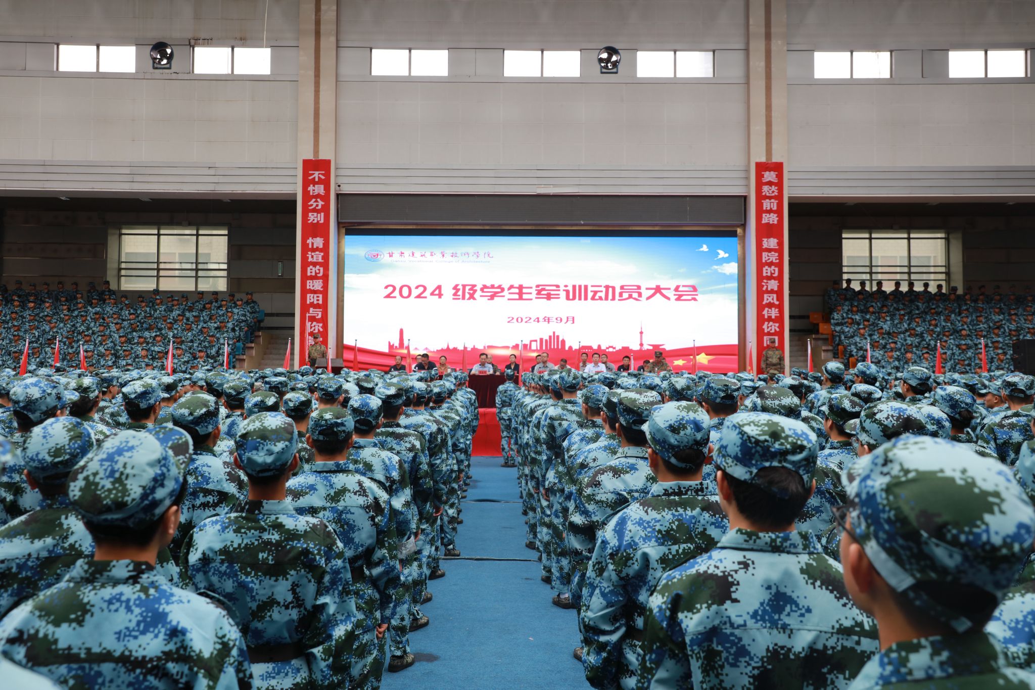 9月1日,甘肃建筑职业技术学院2024级学生军训动员大会暨开训仪式成功举行,军训工作领导小组组长、学校党委副书记、校长党星海,军训工作领导小组副组长、党委委员、副校长高忠有,学校党委委员、纪委书记、监察专员杜彦斌,二级学院、相关部门负责人以及军训团工作人员参加仪式。