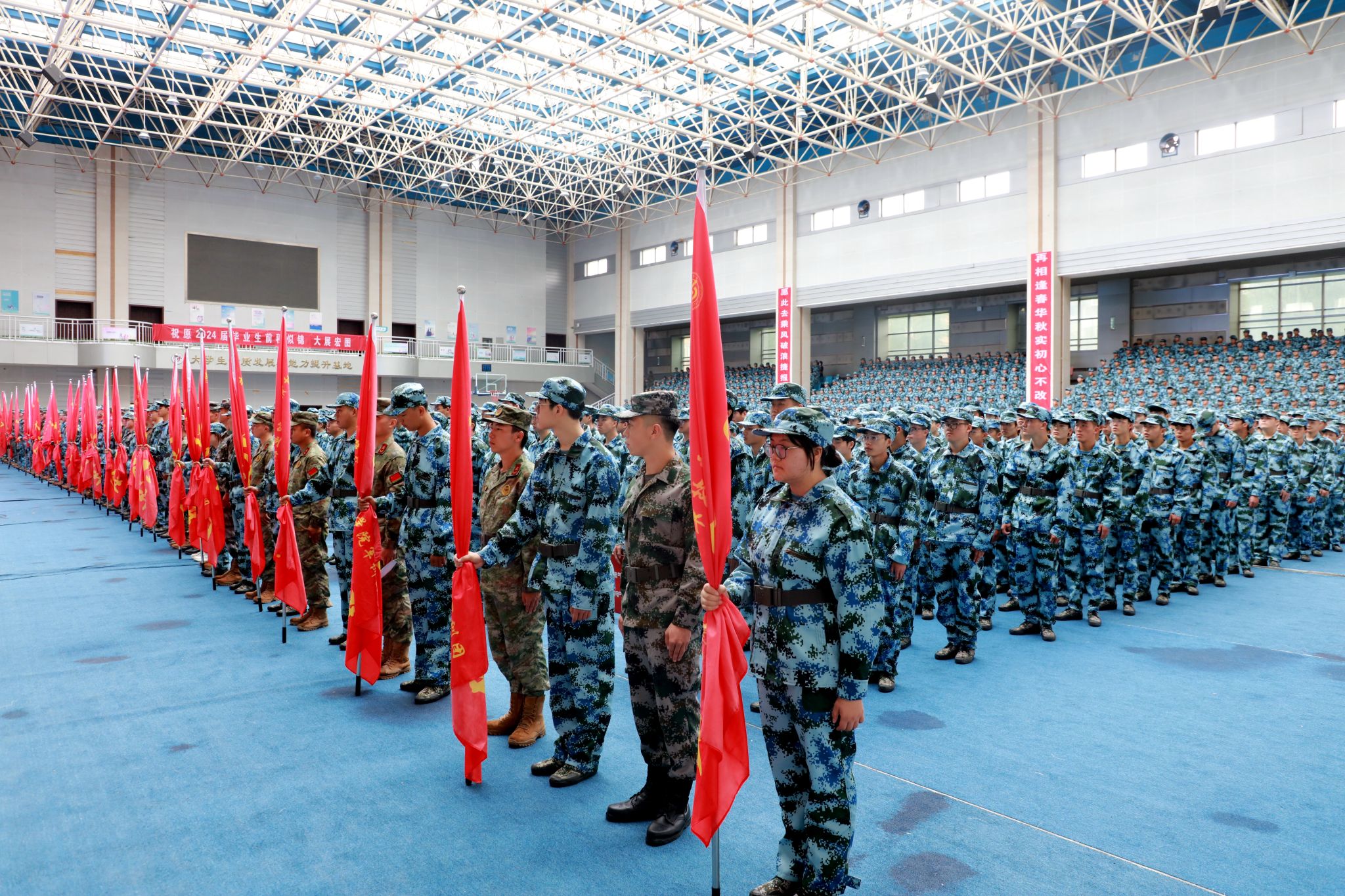 随后,由学生代表领读,参加军事技能训练的全体同学向军训团团旗宣誓,在《中国人民解放军军歌》声中,甘肃建筑职业技术学院2024级学生军训正式开始,军训为期两周,将于9月14日结束。
