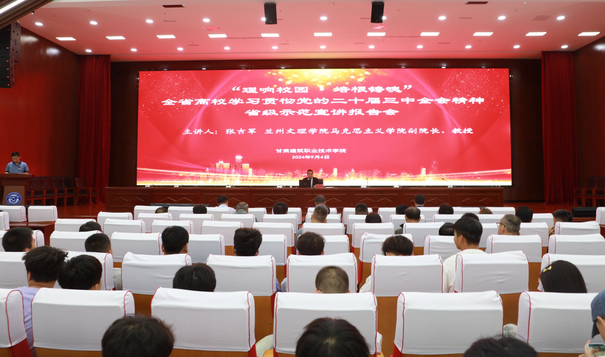 为全面深入学习宣传贯彻党的二十届三中全会精神,坚持不懈用党的创新理论铸魂育人,打造“理响校园·培根铸魂”理论宣讲工作品牌,根据相关工作要求,9月4日,甘肃建筑职业技术学院举办了“理响校园•培根铸魂”全省高校学习贯彻党的二十届三中全会精神省级示范宣讲报告会,报告会由兰州文理学院马克思主义学院副院长张吉军教授主讲,学校党委副书记、校长党星海,党委委员、副校长高忠有,党委委员、纪委书记、监察专员杜彦斌,全体中层干部、各党支部和党总支书记、支委,以及学生代表聆听了讲座。党委宣传部部长高建兴主持。
