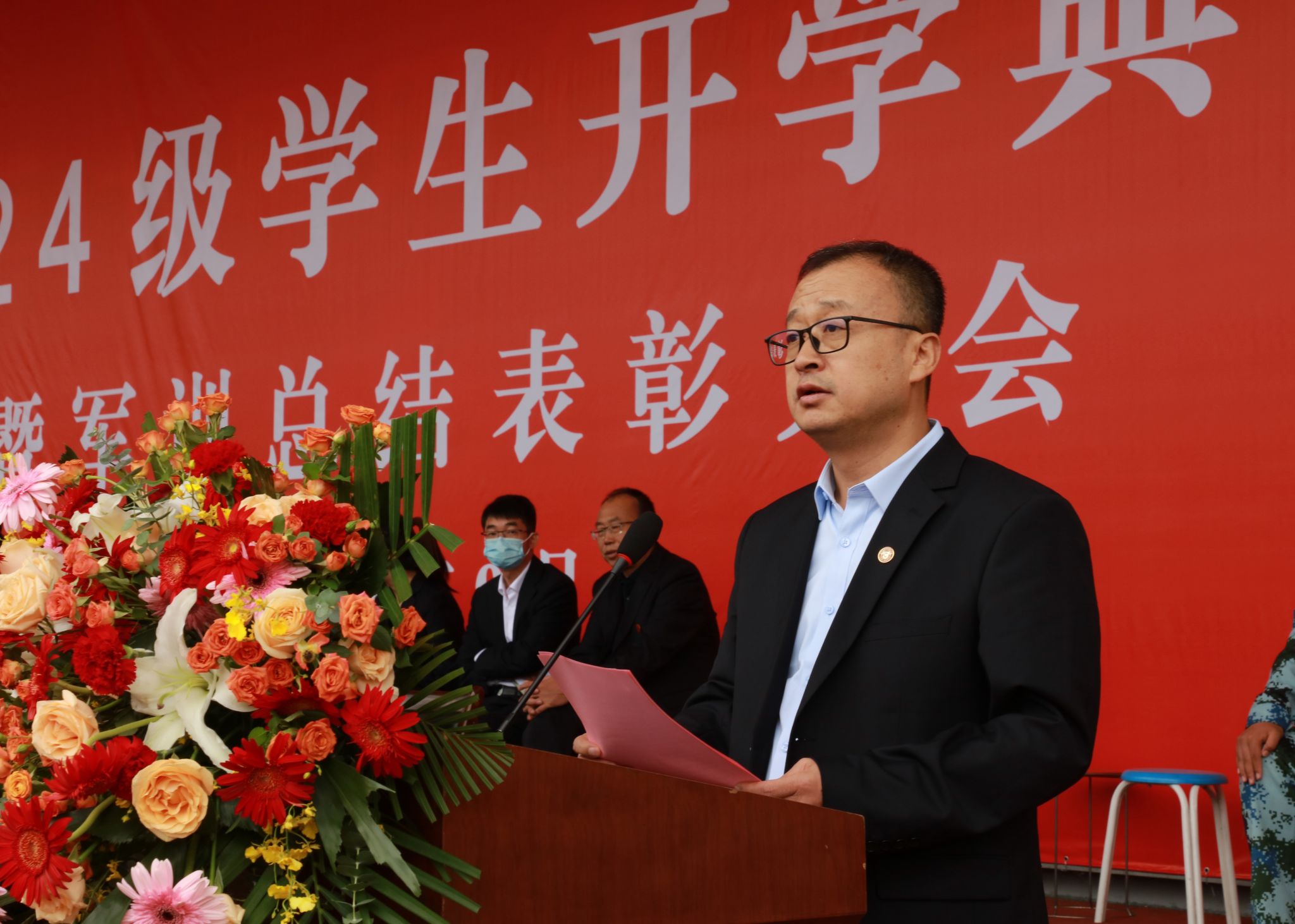 高忠有同志宣读了先进集体及先进个人的表彰文件,主席台领导和嘉宾为获奖集体和个人颁奖。党星海同志为承训部队赠送锦旗,表达了对合作单位的衷心感谢。随后,进行了2024级学生开学典礼。党星海为2024级学生代表颁发学生证、校徽和《学生手册》,并请2024级全体学生佩戴校徽。