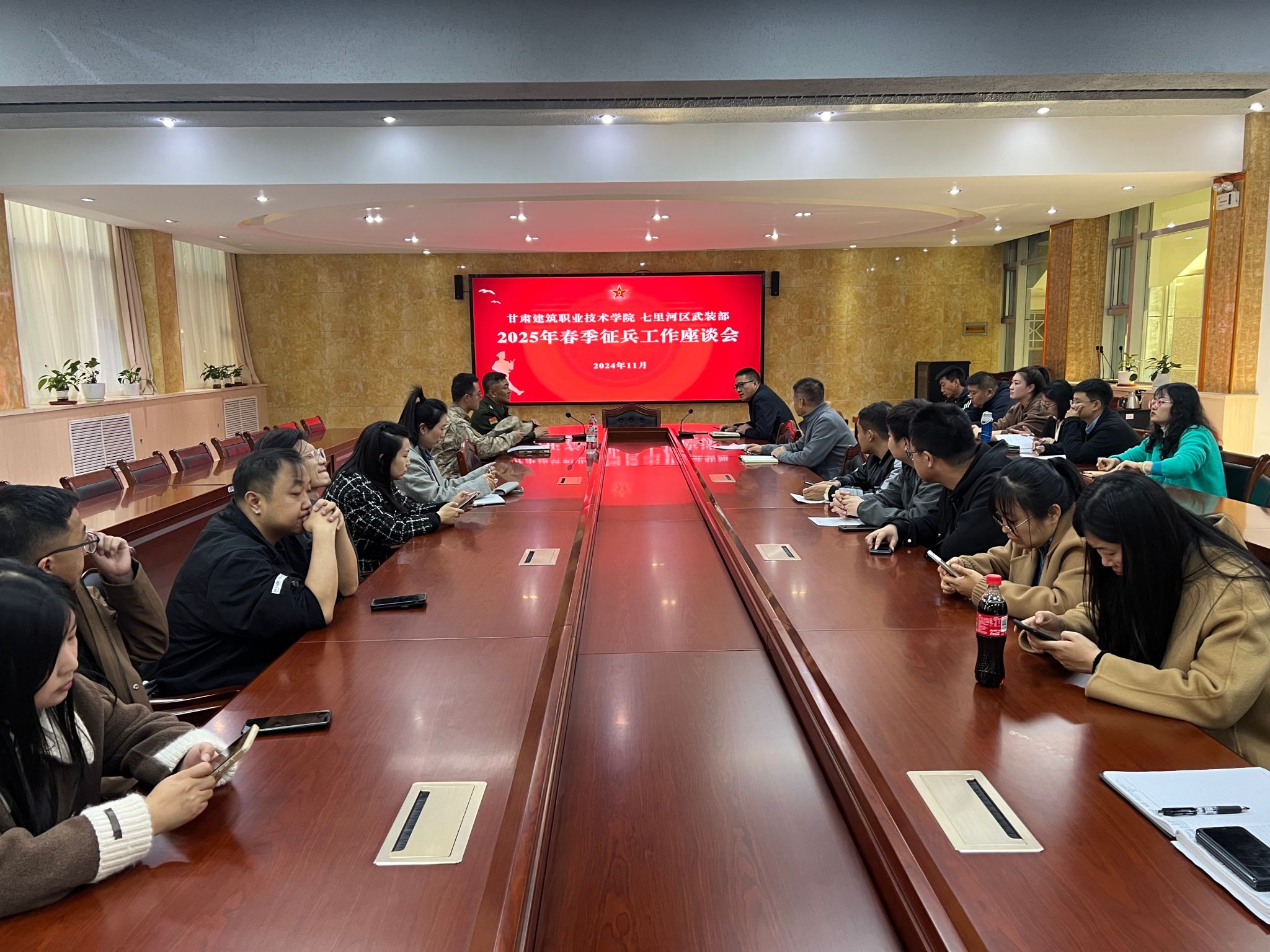 11月7日,学院召开了2025届毕业生征兵工作座谈会,七里河区武装部部长谢宏胜及武装部相关工作人员,我院学生工作处处长许庆兵、副处长张希玮,学生处干事苏毅以及全体2025届毕业班专、兼职辅导员参会。