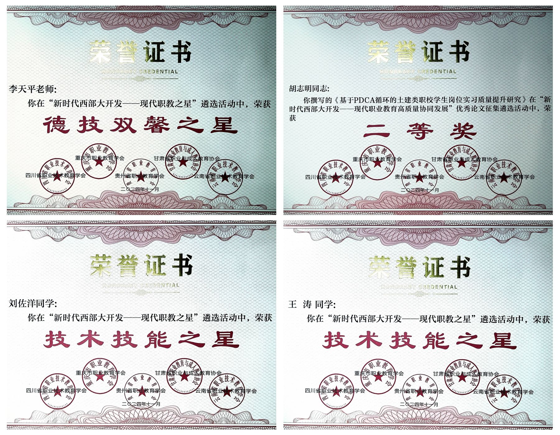 今年8月,我校根据甘肃省职业与成人教育协会《关于开展“新时代西部大开发——现代职教之星”和“新时代西部大开发——现代职业教育高质量协同发展”优秀论文遴选工作的通知》要求,遴选报送的成果在本次大会中荣获多项荣誉,其中建筑工程学院副院长李天平获评“德技双馨之星”教师,建筑工程学院学生刘佐洋、王涛获评“技术技能之星”学生,建筑工程学院教师胡志明撰写的论文《基于PDCA循环的土建类职校学生岗位实习质量提升研究》获评职业教育“优秀论文”二等奖。