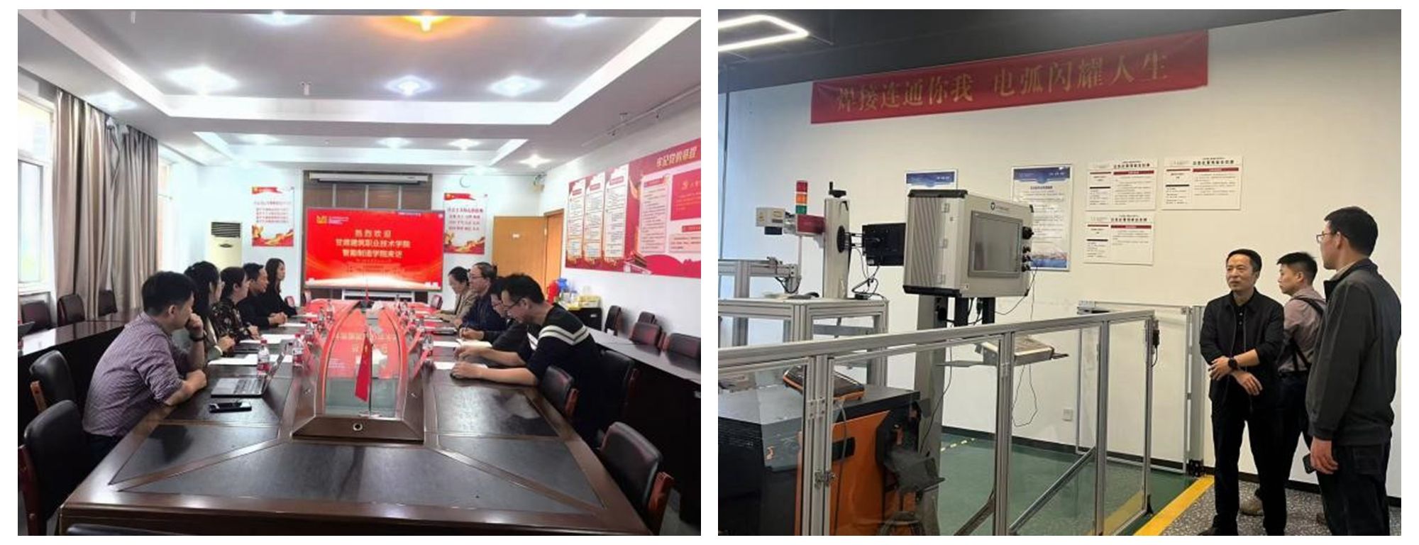 在金华职业技术大学智能制造学院,学院戴欣平院长详细介绍了学院的办学特色、专业设置及人才培养工作,与王成一行分享了学校“双高计划”建设及实训基地建设的成效与经验做法。双方座谈交流后,对校校合作及专业建设进行了实质探讨,并实地参观了电气自动化技术实训基地、智能化精密制造实训中心和工业机器人技术实训中心。