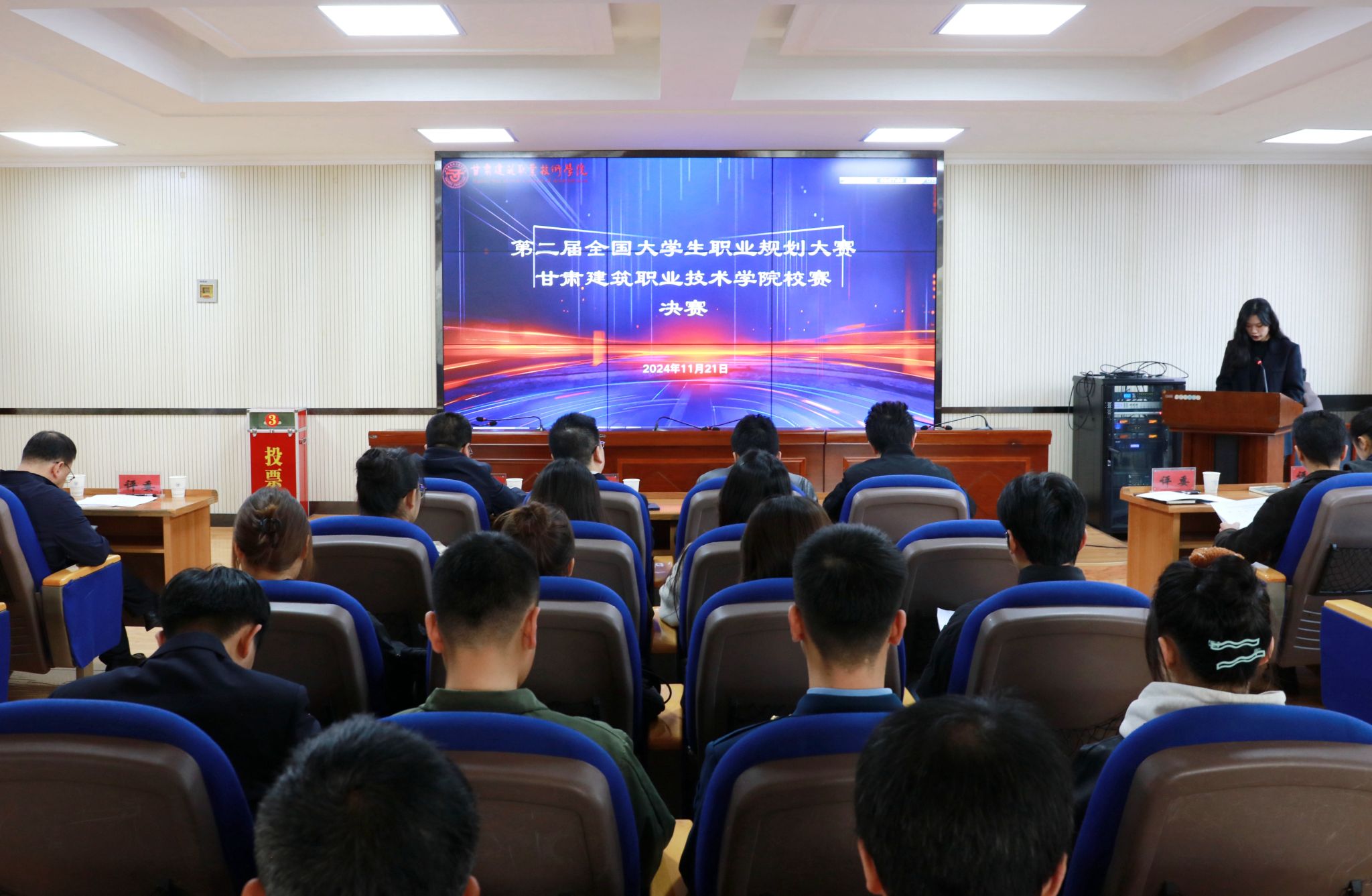 为贯彻落实党中央、国务院决策部署,落实《国务院关于印发“十四五”就业促进规划的通知》精神,加强高校生涯教育和就业指导,增强大学生职业规划意识,促进高质量充分就业。甘肃省教育厅定于2024年11月至2025年2月举办第二届全国大学生职业规划大赛甘肃省赛。根据省教育厅关于大赛安排,11月21日,我校在学术报告厅举行了第二届全国大学生职业规划大赛校决赛。兰州大学招就处处长贺鹏,我校校友、甘肃西特项目管理有限公司董事长马永志,学校招就处和二级学院相关负责人、参赛选手和指导教师参加了大赛。