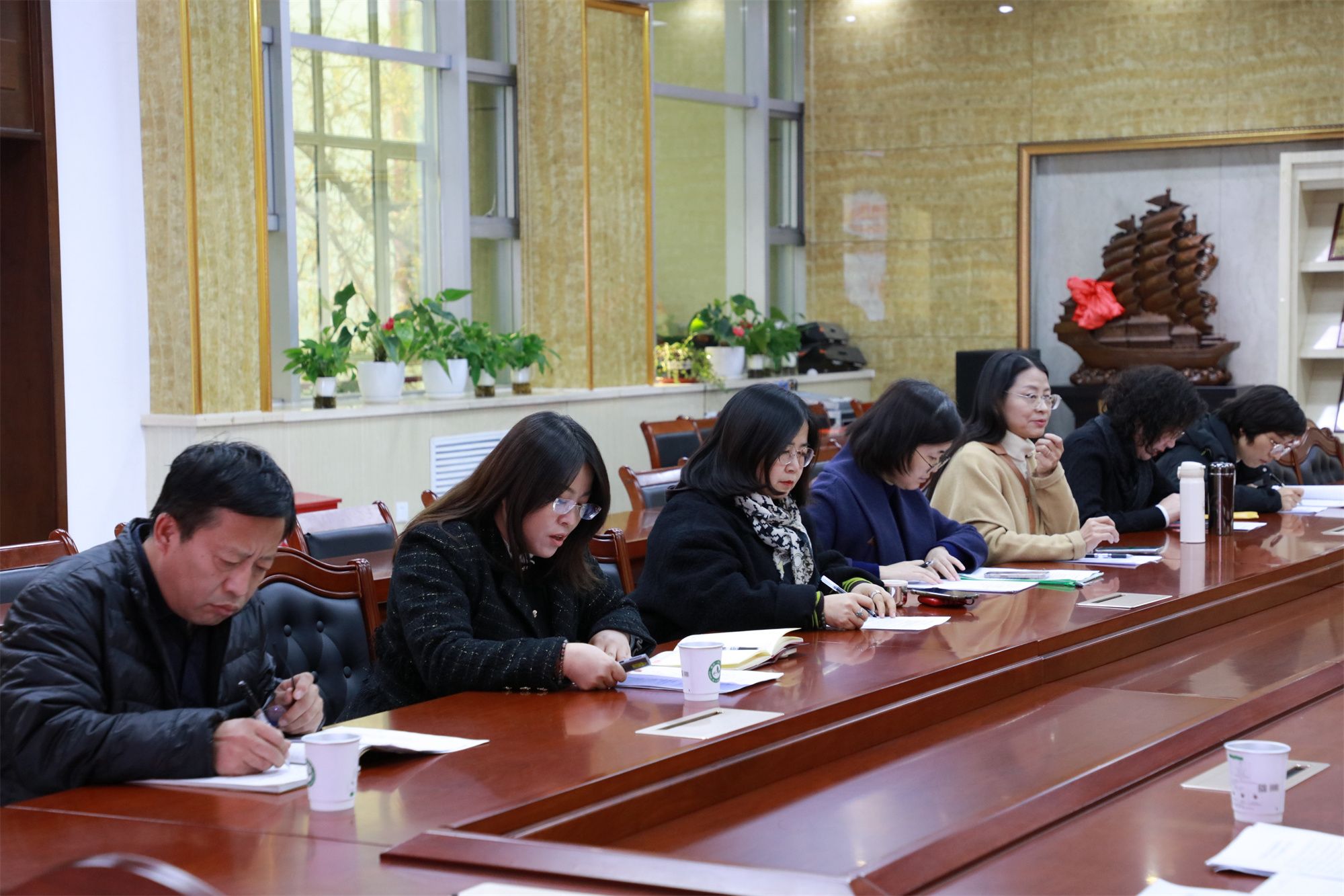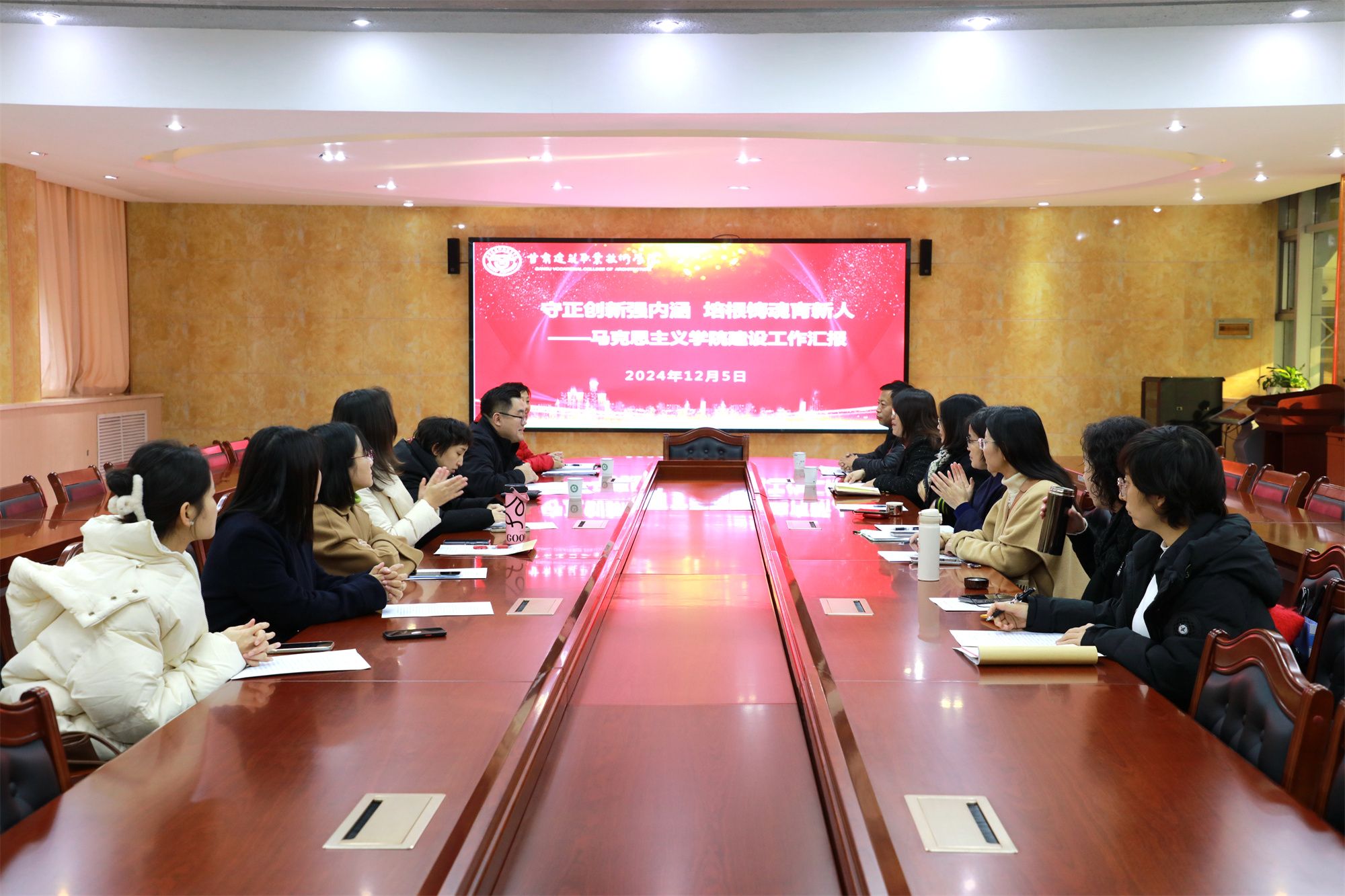 会议伊始,马克思主义学院院长王瑛从“完善健全机构,强化组织管理”“健全工作机制,增强社会影响力”“打造精品课堂,提升教师业务素养”“以赛促教强素养,锤炼技能展风采”以及“进一步发展举措与思考”五个方面对马克思主义学院建设工作作出详细汇报,在汇报中提到思想政治理论课应该突出课堂主渠道作用,立足思想政治理论主阵地,结合实际,采取多种形式,持续加强和改进教育教学方式方法途径,加强“大思政课”建设,认真学习贯彻落实习近平总书记关于教育的重要论述,坚持用习近平新时代中国特色社会主义思想铸魂育人,聚焦立德树人根本任务。