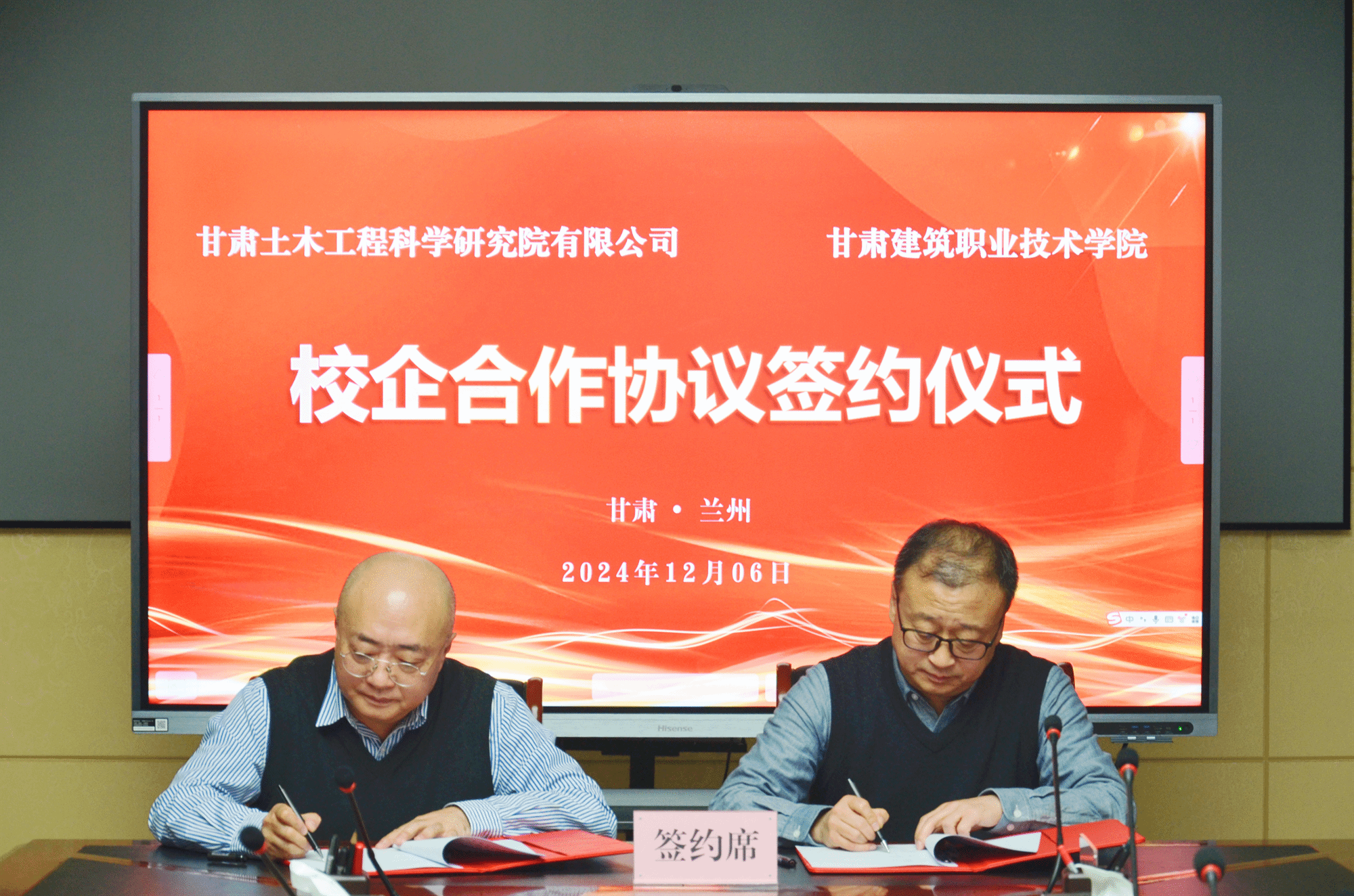 为深化产教融合,助力科研落地,强化技术技能人才培养。12月6日,甘肃建筑职业技术学院与甘肃土木工程科学研究院举行了校企合作协议签约仪式,学校党委副书记、校长党星海,甘肃土木工程科学研究院董事长曹庆,学校党委宣传统战部部长高建兴,教务处、科技处处长席攀锋,办公室主任黄治学,建筑工程学院副院长李斌及企业相关部门负责人等参加。