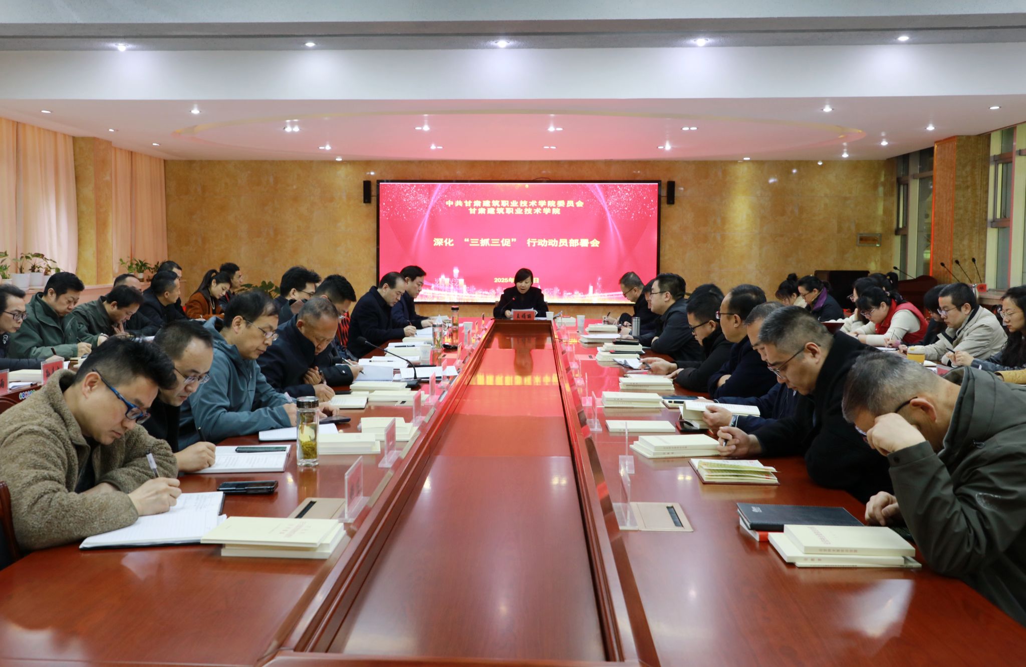 会议由王娟丽主持。会上,王娟丽同志传达了《甘肃建筑职业技术学院深化 “三抓三促” 行动工作方案》,方案明确了目标任务和具体措施、组织领导和职责分工。并部署了三个方面的重点任务,一是抓学习促能力提升,要组织教职工深入学习研讨,开展专题讲座,通过多种形式营造浓厚学习氛围。各部门要围绕学院发展战略、专业建设、人才培养等开展调研,为学院决策提供依据。二是抓执行促任务落实,要对照年度党建和行政重点任务,以及2025年“三抓三促”重点任务台账,细化分工,确保各项任务落地落实。三是抓效能促事业发展,重点围绕“双高计划”建设,不断提升教育教学质量,推进智慧校园建设,加强师资队伍建设。