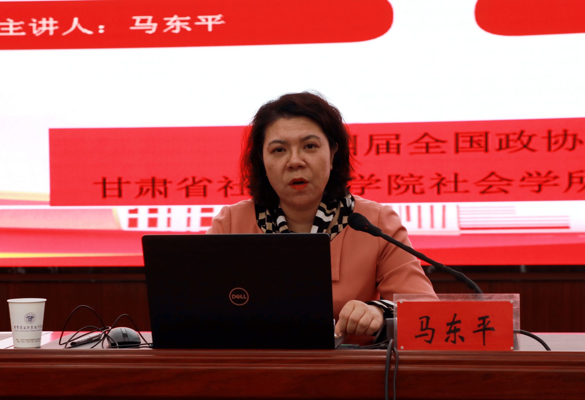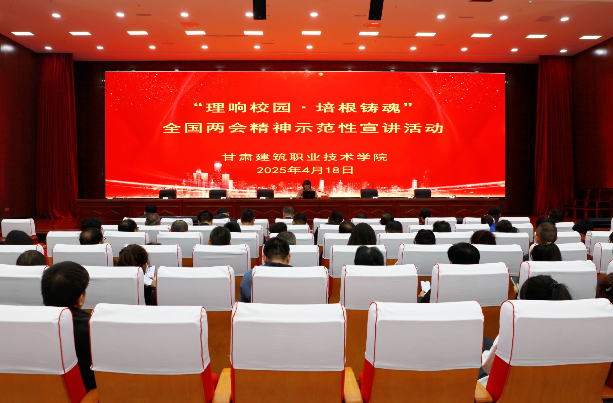 为全面深入学习贯彻全国两会精神,根据省委教育工委统一安排,4月18日,我校举办“理响校园 培根铸魂”全国两会精神示范性宣讲活动,邀请甘肃省社会科学院社会学研究所所长马东平现场做宣讲,学校党委书记王娟丽及领导班子成员,中心组全体成员,教师及学生代表现场聆听了宣讲。党委宣传统战部高建兴主持。