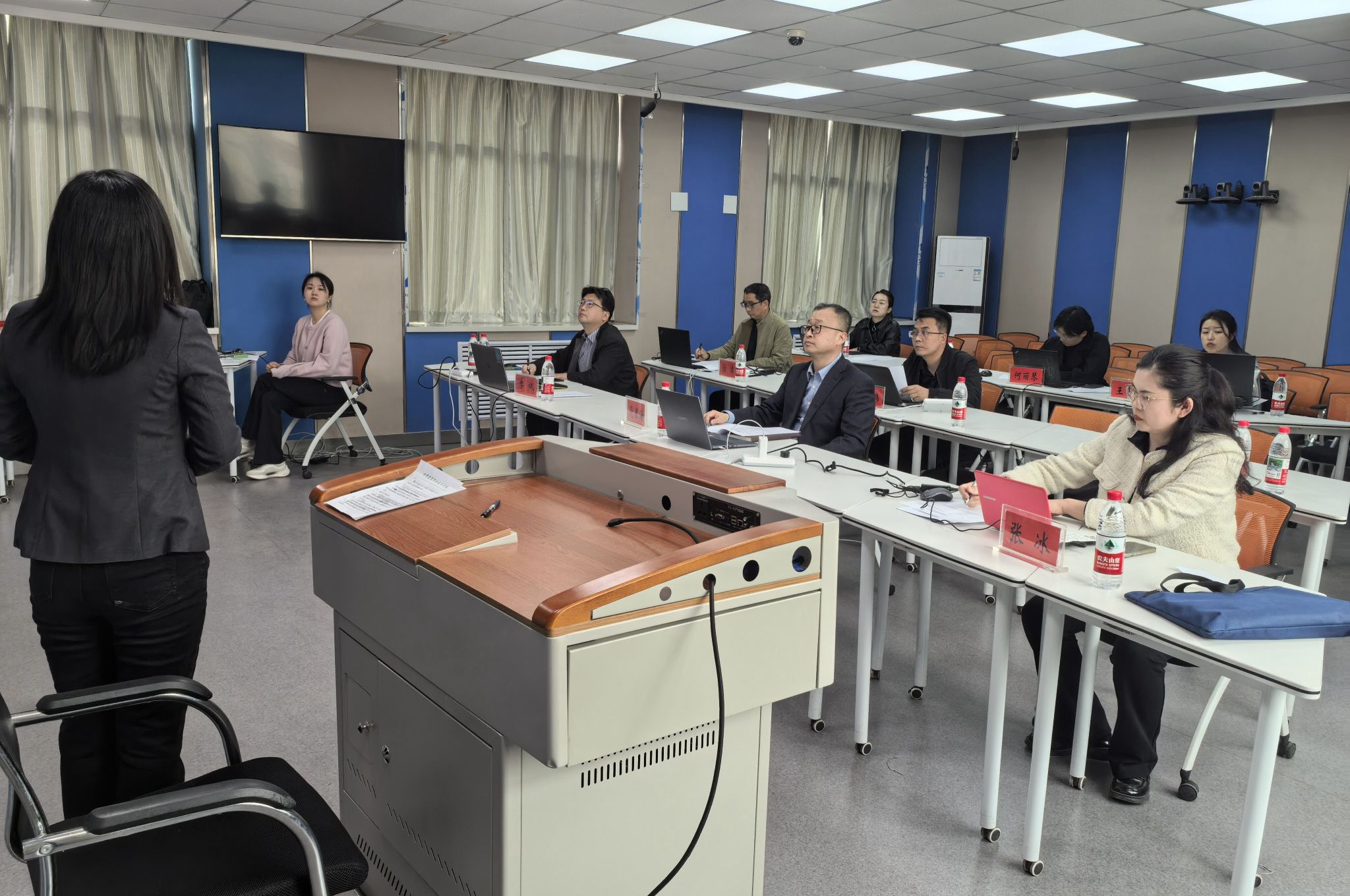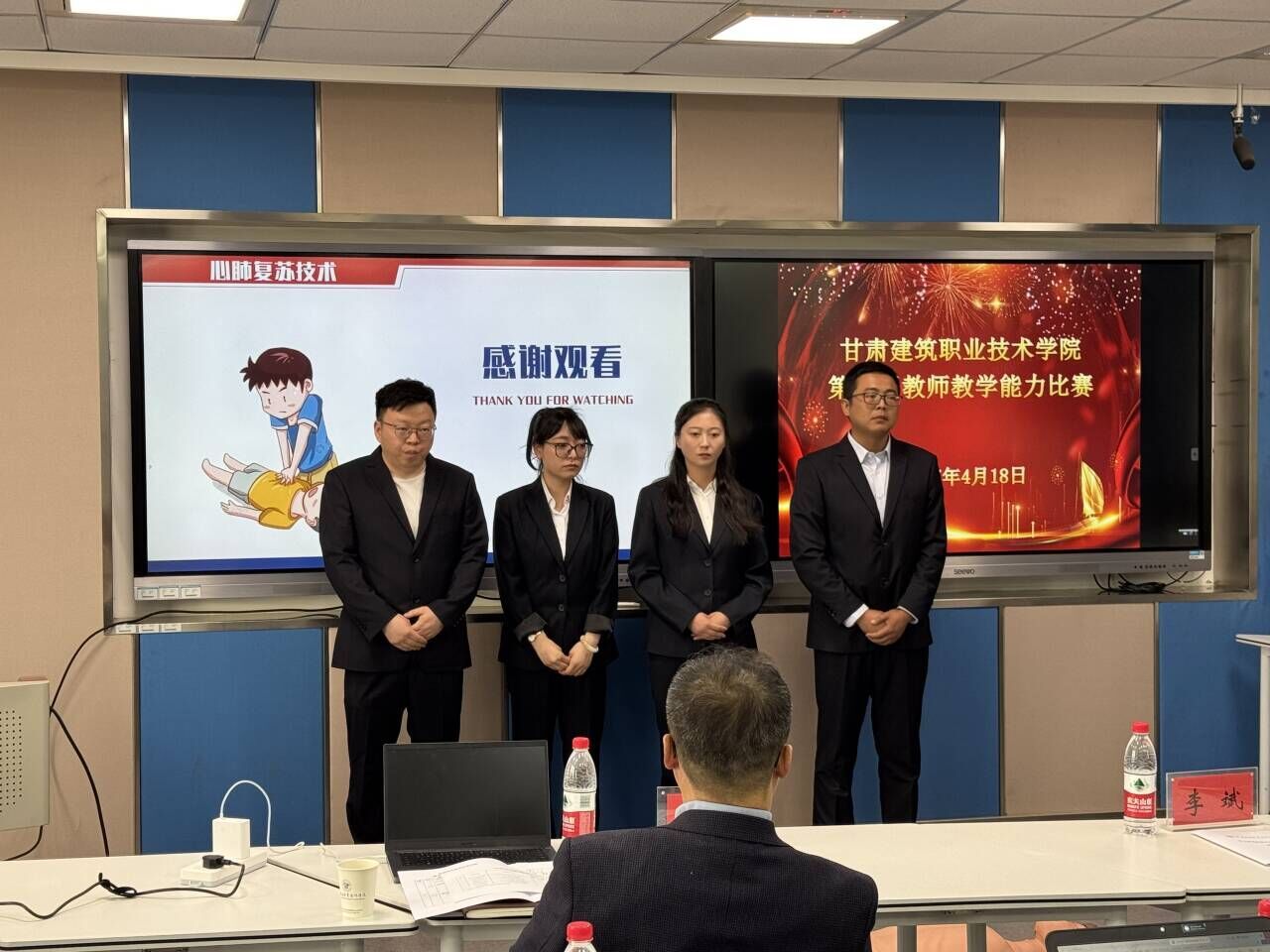 此次比赛对标甘肃省职业院校技能大赛教学能力比赛的要求和环节,分为专业课程一组、专业课程二组两个组别,各组别的教学团队首先介绍教学实施报告,然后针对抽选教案中的自选内容进行无学生教学展示,最后回答评审专家提问。