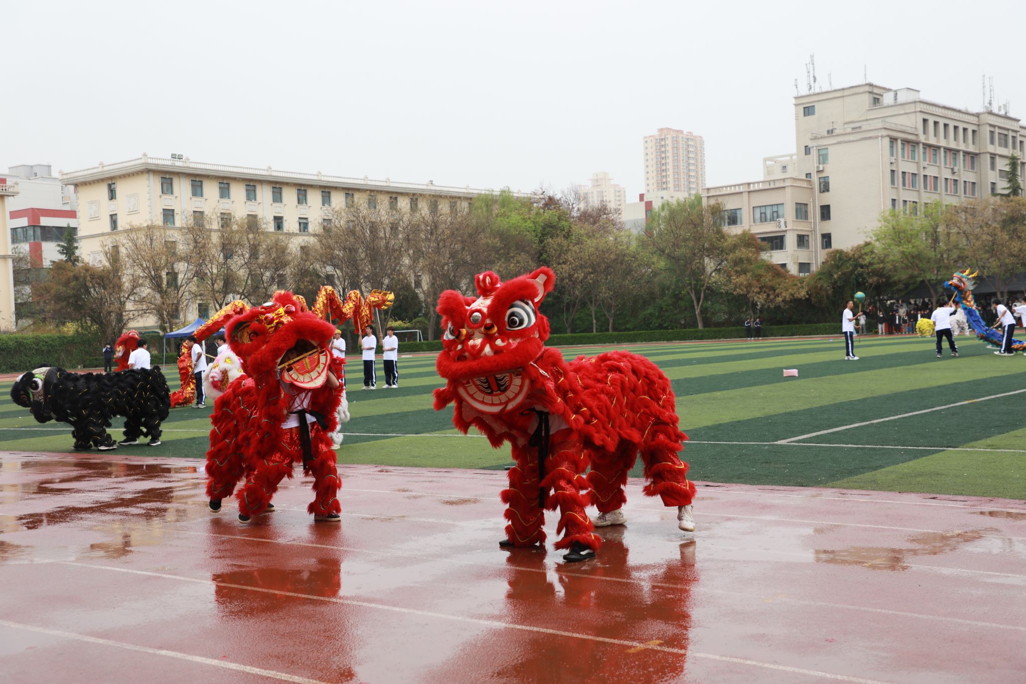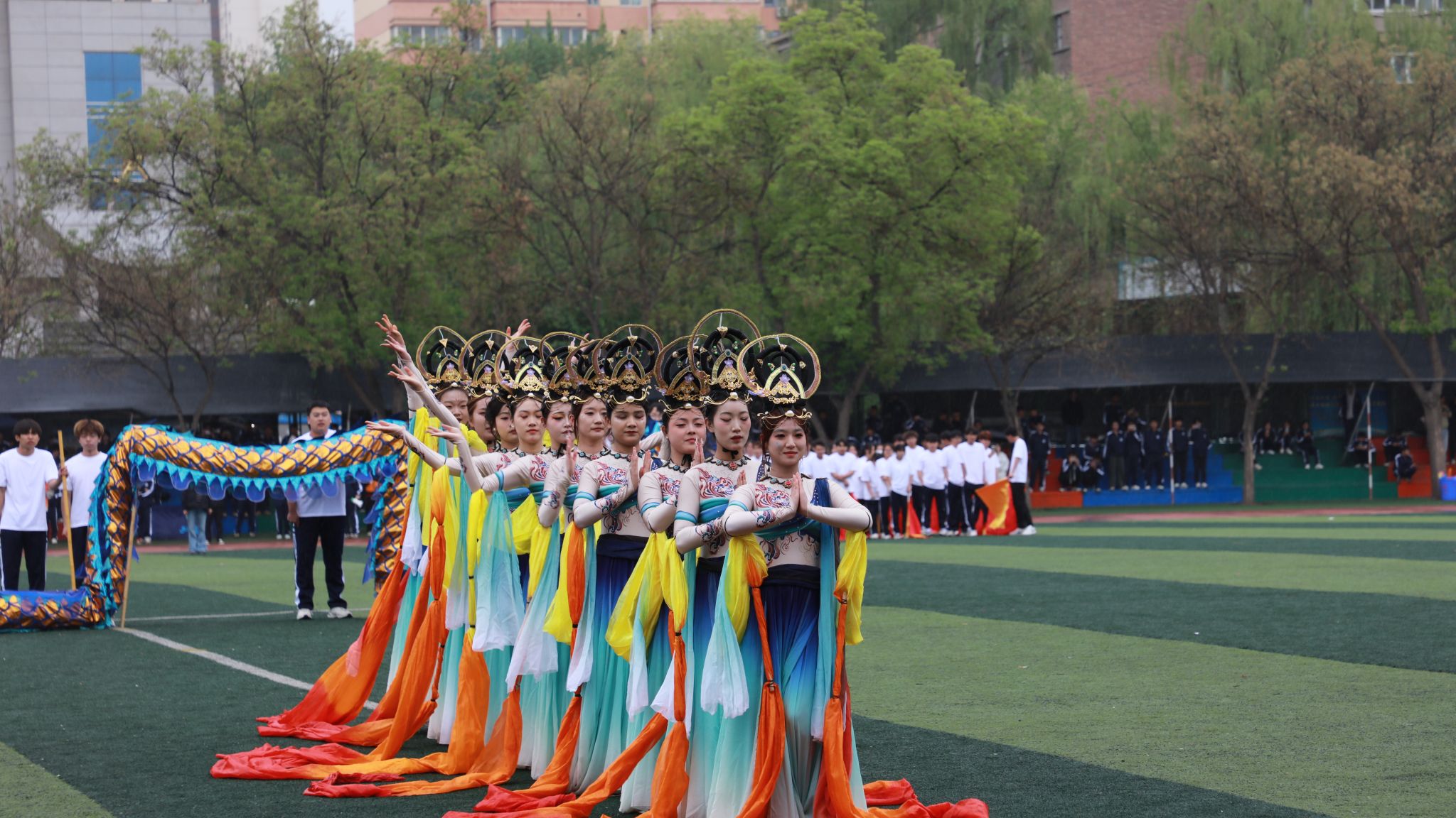 随后,运动员与裁判员退场,开幕式团体操表演登场。龙狮表演活力四射,展现了传统文化的勃勃生机;“飞天绘梦”以优雅的舞姿勾勒文化底蕴,令人陶醉;团体操整齐划一,气势恢宏,充分彰显建院学子奋发向上、团结拼搏的精神风貌,精彩纷呈的节目表演将现场气氛推向高潮,点燃全场观众的热情。