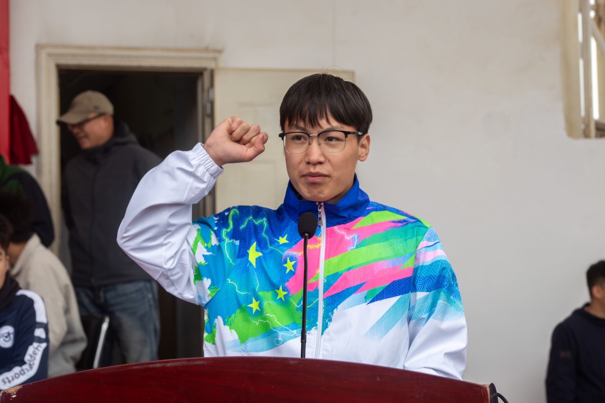 23建筑室内设计2班学生马斌雄代表运动员宣誓,承诺以实际行动践行“更高、更快、更强”的体育精神。