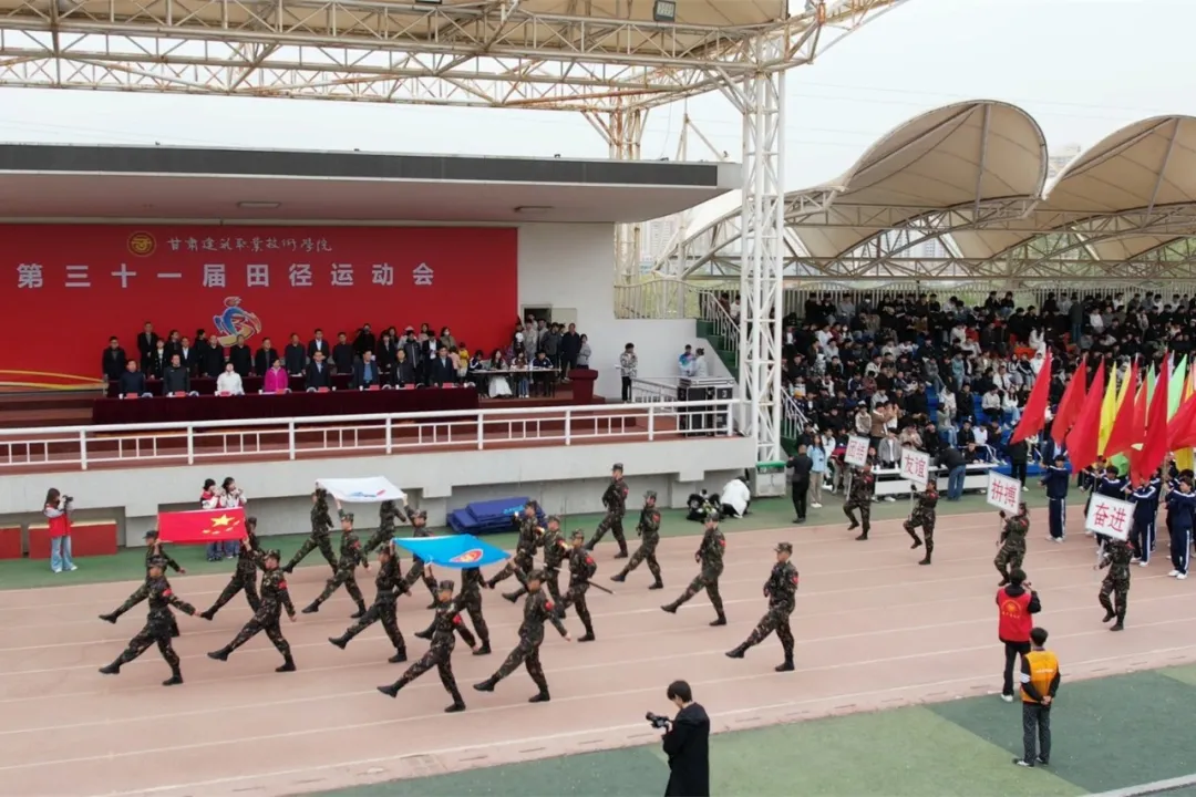 上午8:30分,开幕式开始,彩旗队、退役军人方队、团体操方队、裁判员方队、各二级学院方队依次入场。他们步伐铿锵、口号嘹亮,展现了建院师生朝气蓬勃的精神风貌。入场表演精彩纷呈,现场掌声雷动,气氛热烈。随后王娟丽宣布甘肃建筑职业技术学院第三十一届田径运动会开幕。