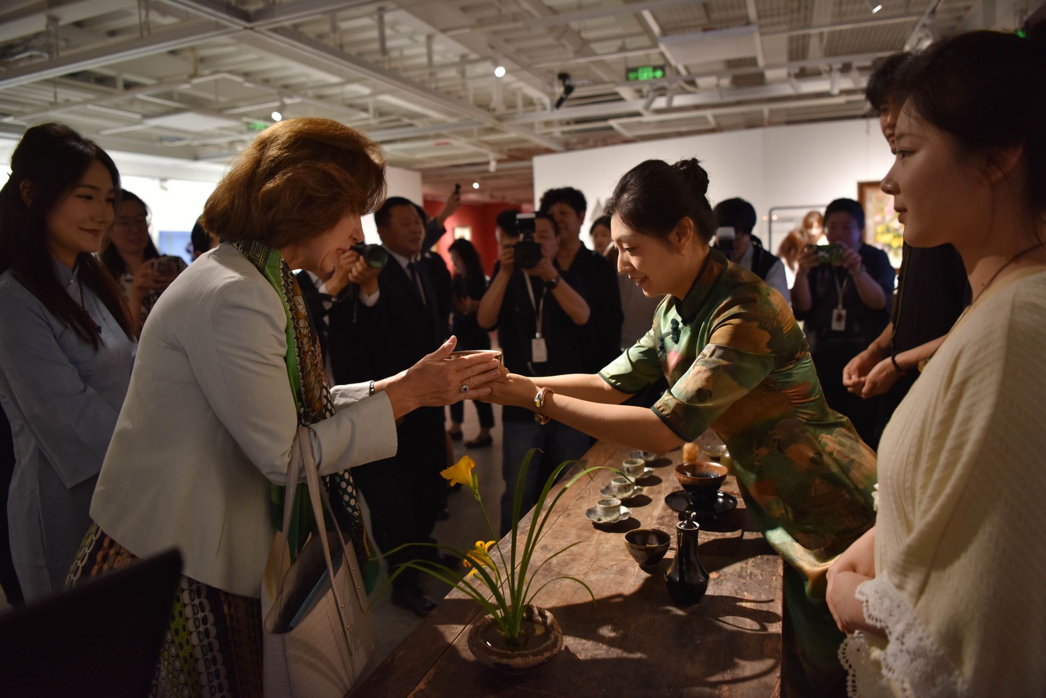 交流活动现场,省级茶艺技能大师蔡萍团队以“七汤点茶法”再现宋代《大观茶论》精粹。茶筅击拂间,茶沫渐起,展现出“疏星皎月”之象,这项古老的技艺,在数字技术的赋能下焕发新生。工作室研发的人工智能系统“弱水”以茶文化传播大使的身份,将茶百戏中“水丹青”的哲学意蕴转译为当代艺术语言,实现深度文化对话。吴若兰大使被这一独特的茶艺展演深深吸引,她专注地观看每一个步骤,不时点头称赞,对宋代点茶和数字人“弱水”表现出了浓厚的兴趣。