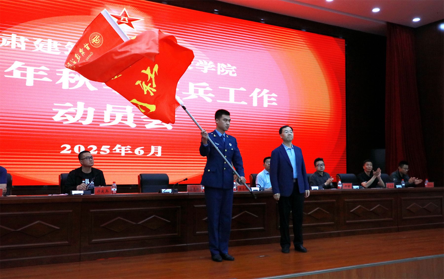 大会在庄严的国歌声中拉开帷幕,许庆兵宣读了《甘肃建筑职业技术学院关于做好2025年大学生应征入伍工作的通知》,通报了2025年上半年学校征兵情况。