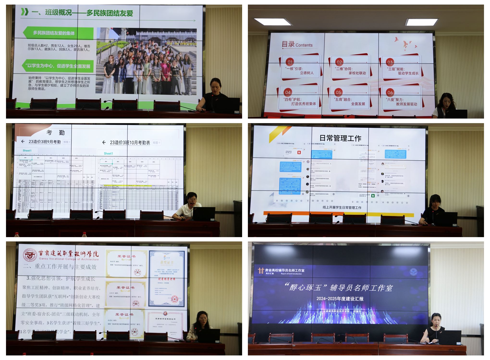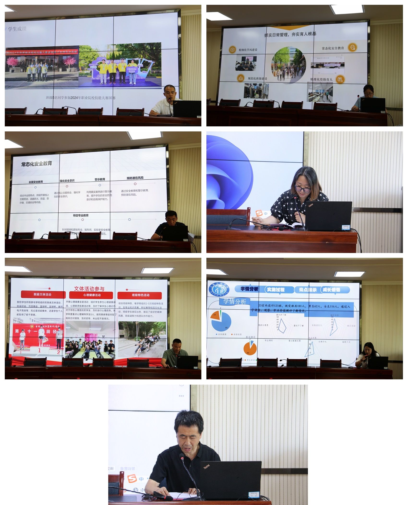 会上,建筑工程学院专职辅导员、班主任李锋,兼职辅导员、班主任任杰;交通工程学院专职辅导员、班主任刘娟,兼职辅导员、班主任武琎;智能制造学院专职辅导员、班主任邸晓燕、兼职辅导员、班主任王靖;人居工程学院专职辅导员、班主任骆雯,兼职辅导员、班主任王向华;建筑经济管理学院专职辅导员、班主任林瑛、王慧;测绘地理信息学院专职辅导员、班主任史蕊,兼职辅导员、班主任万应玲;“醇心琢玉”辅导员名师工作室主持人刘丽华依次进行述职。