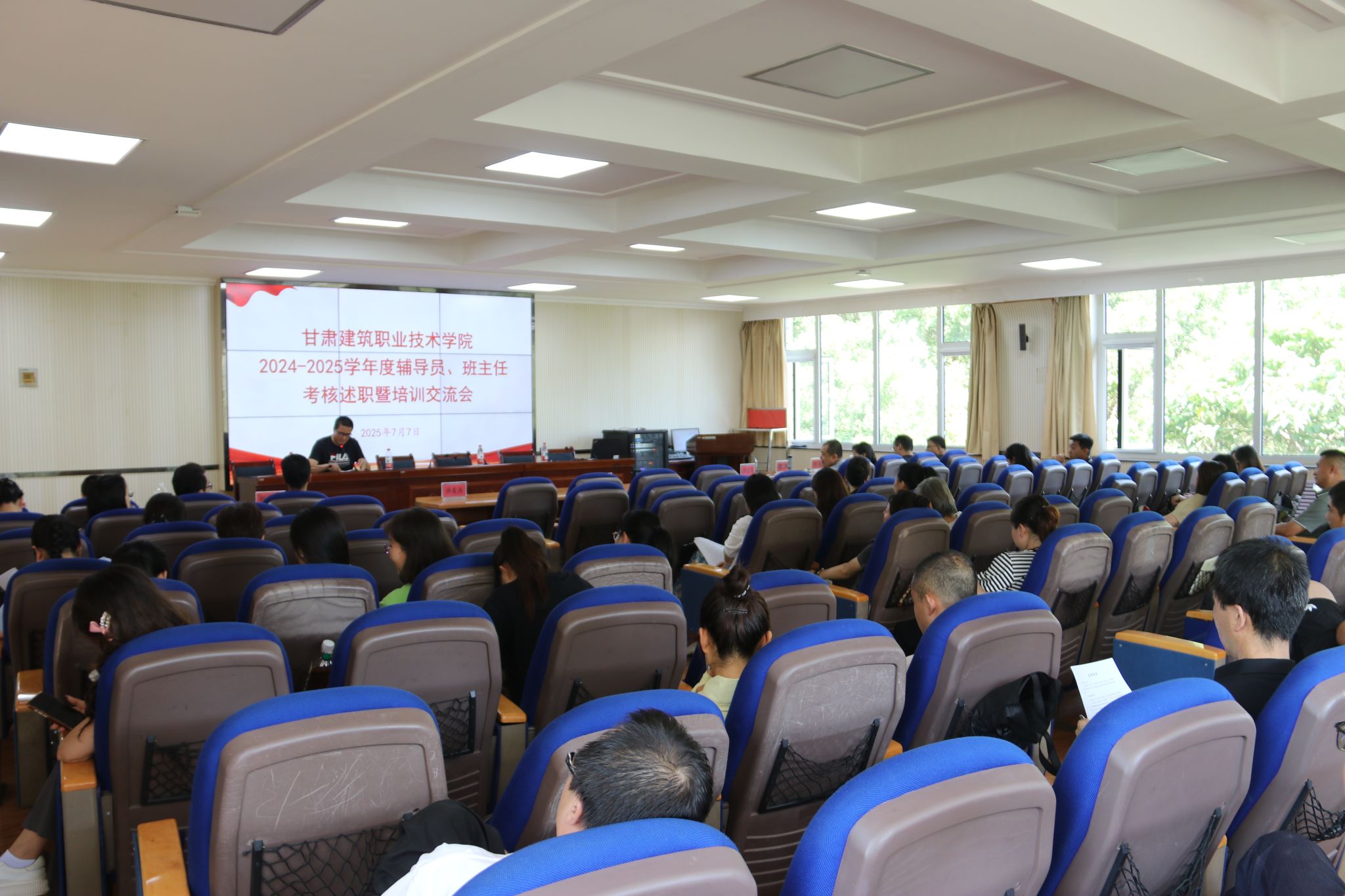 为科学、客观、合理评价辅导员、班主任的德才表现和工作业绩,充分发挥考核的激励、评价、交流与引导作用,促进辅导员、班主任队伍专业化、职业化建设,根据《甘肃建筑职业技术学院关于开展2024-2025学年度辅导员、班主任考核工作的通知》(甘建职院学发〔2025〕13号)的要求与安排,7月7日上午,学校在学术报告厅召开了2024-2025学年度辅导员、班主任考核述职暨培训交流会。学校学生工作处人员,二级学院书记、学生干事及全体一线专、兼职辅导员、班主任参加了会议。会议由学生工作处处长许庆兵主持。