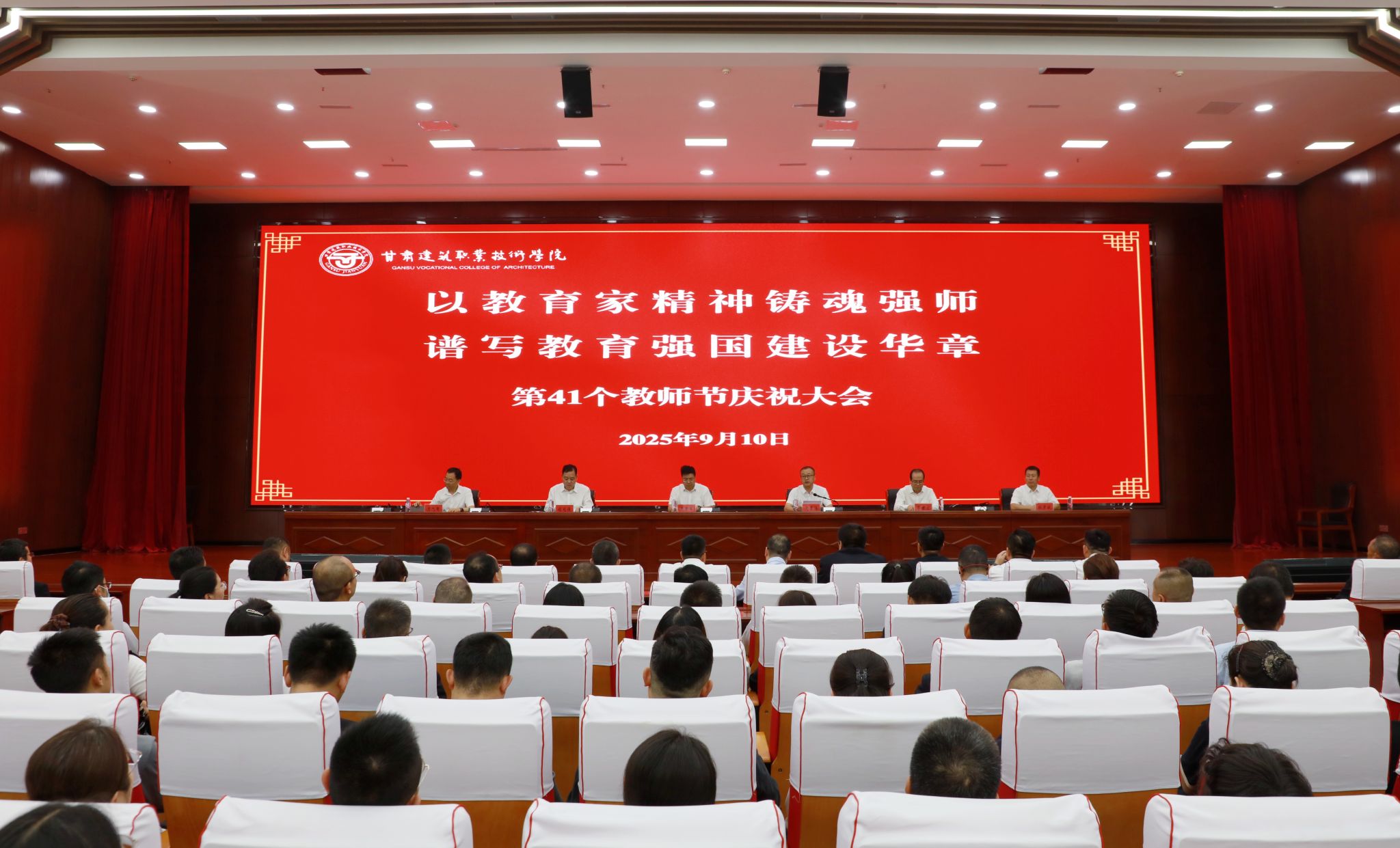 9月10日,甘肃建筑职业技术学院召开了第41个教师节庆祝大会,此次庆祝大会主题为“以教育家精神铸魂强师 谱写教育强国建设华章”,党委书记赵彦军及领导班子成员,全体教职工参加了大会。党委副书记、校长党星海主持大会。