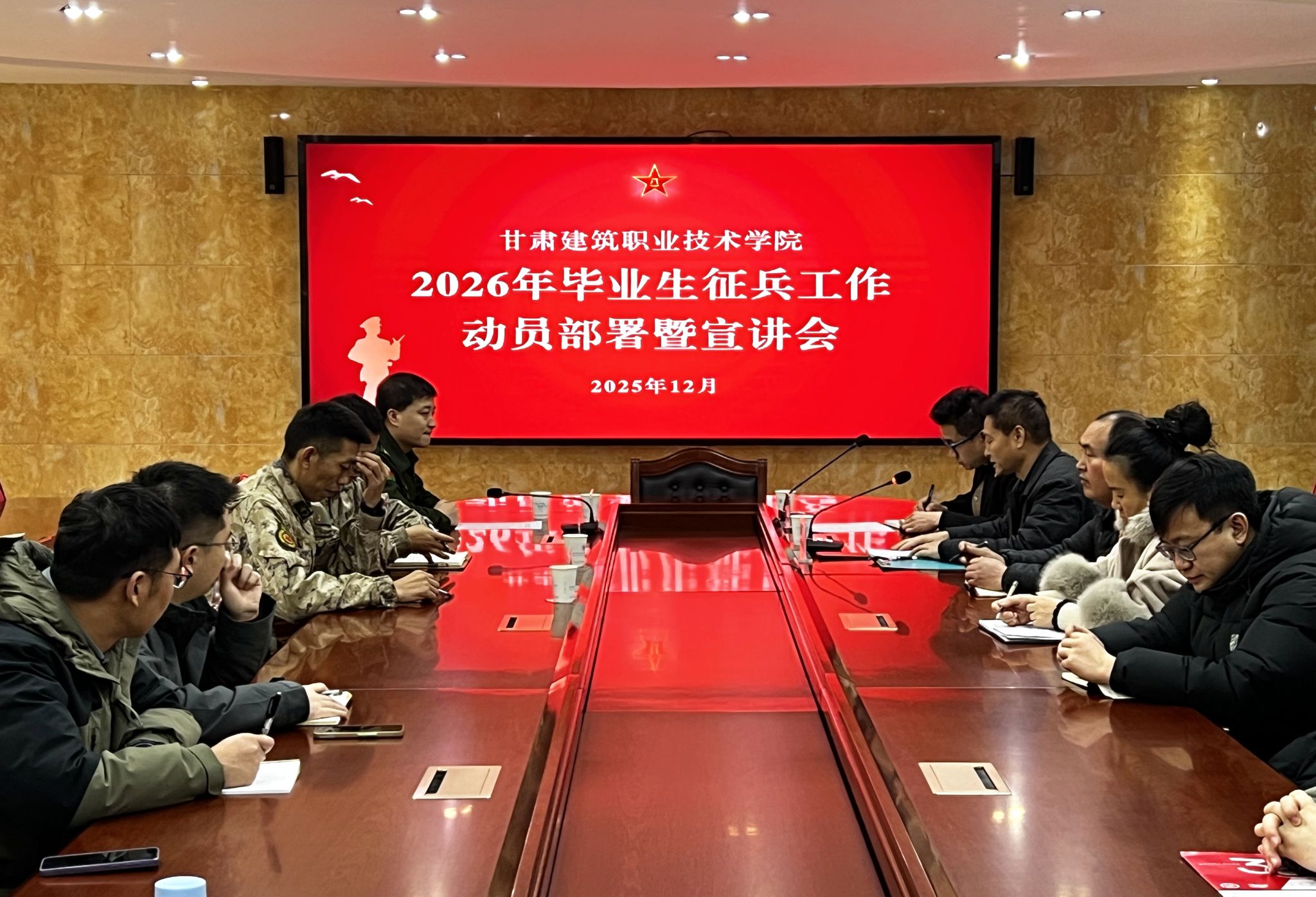12月12日,我校学生工作处与属地武装部共同组织召开了2026年毕业生征兵工作动员部署暨宣讲会。学生工作处负责人,全体毕业班辅导员参加会议,会议由学生工作处副处长张希玮主持。