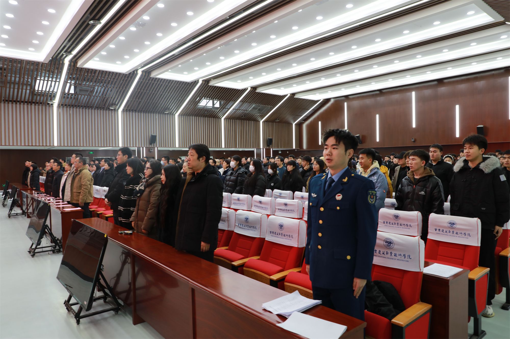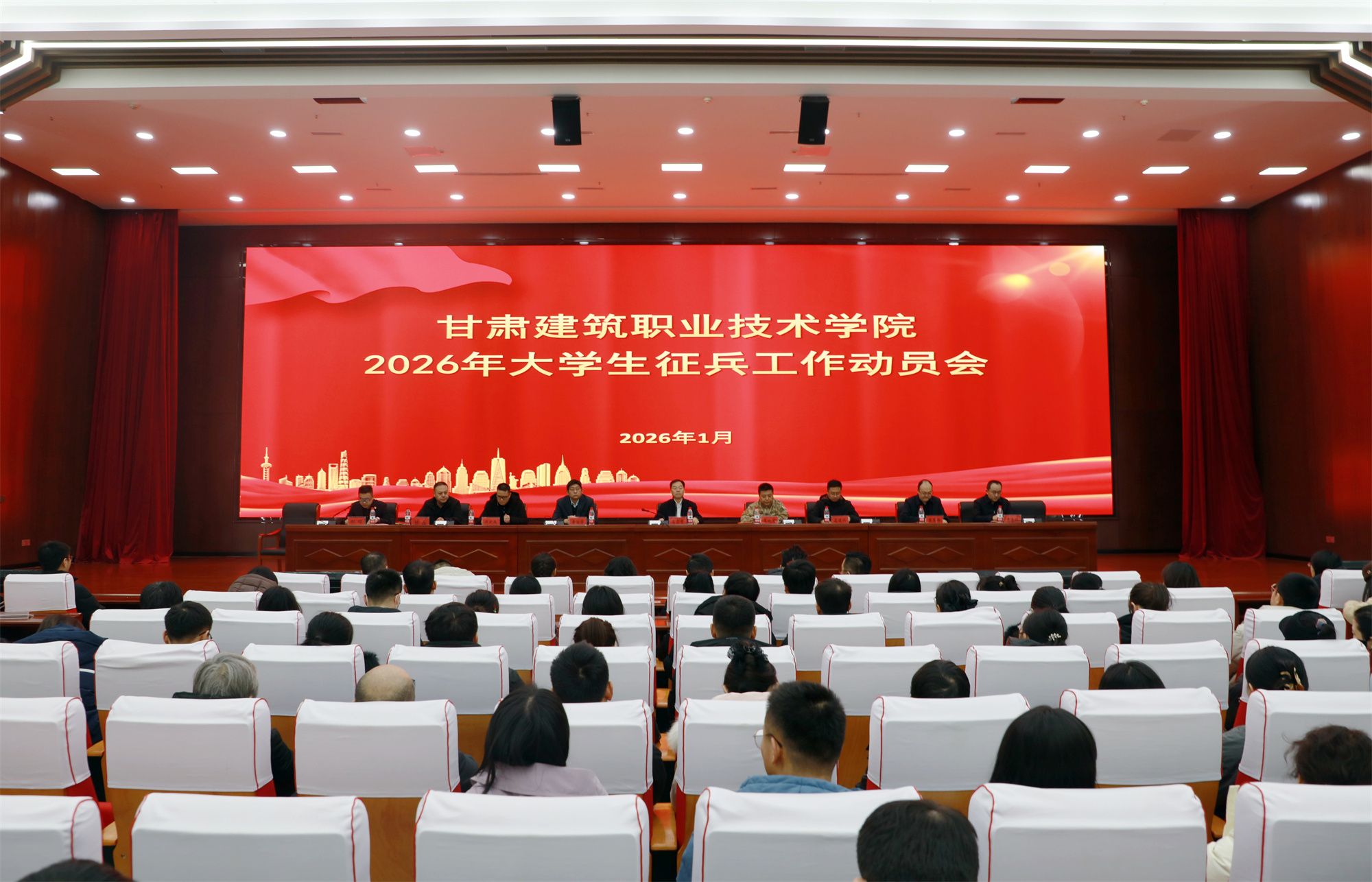 1月5日,甘肃建筑职业技术学院2026年大学生征兵动员大会在多功能厅顺利召开。七里河区武装部副部长王晓文,学校党委委员、副校长高忠有,征兵工作领导小组相关负责人,各二级学院书记,全体辅导员及学生代表500余人参会。党委学生工作部部长郝昭主持大会。