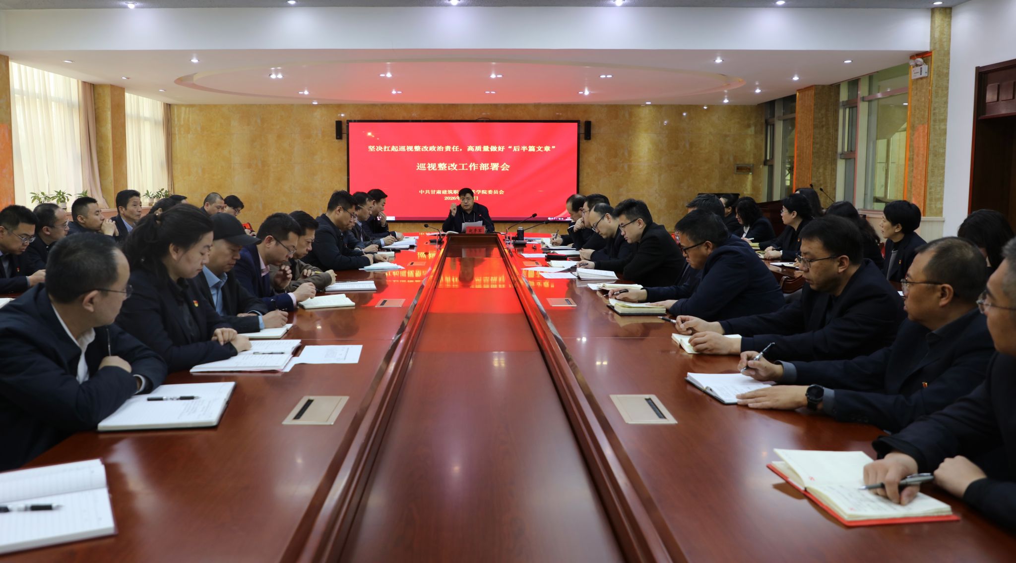 为深入学习贯彻习近平总书记关于巡视工作的重要论述,对学校巡视整改工作进行再动员、再部署、再压实,推动整改工作全面发力、纵深推进,3月6日,我校召开巡视整改工作部署会。党委书记赵彦军主持会议并讲话,对全校巡视整改工作提出明确要求。党委副书记许洁领学习近平总书记关于巡视整改工作的重要论述(节选)、《中国共产党巡视工作条例》“巡视整改和成果运用”章节核心条款,党委委员、副校长高忠有通报《中共甘肃建筑职业技术学院委员会关于省委巡视反馈意见的整改落实方案》,党委委员、副校长锁冠侠传达学校《巡视整改工作实施意见》。领导班子全体成员、各部门主要负责人、巡视整改工作领导小组成员参加会议。