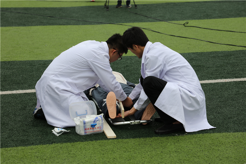 检查伤势、选择包扎方法、伤口清洗、包扎伤口……一系列的救治,医疗救护组对演练中的担架运送、病情诊断、心肺复苏、止血包扎等处理的井井有条。