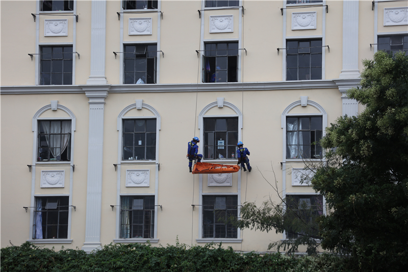 10时11分,人防志愿者搜救进入楼层展开搜救,发现了因受伤未及时撤离的两人,由晏家坪社区医疗救护站立即送到临时医疗救护点进行救治。