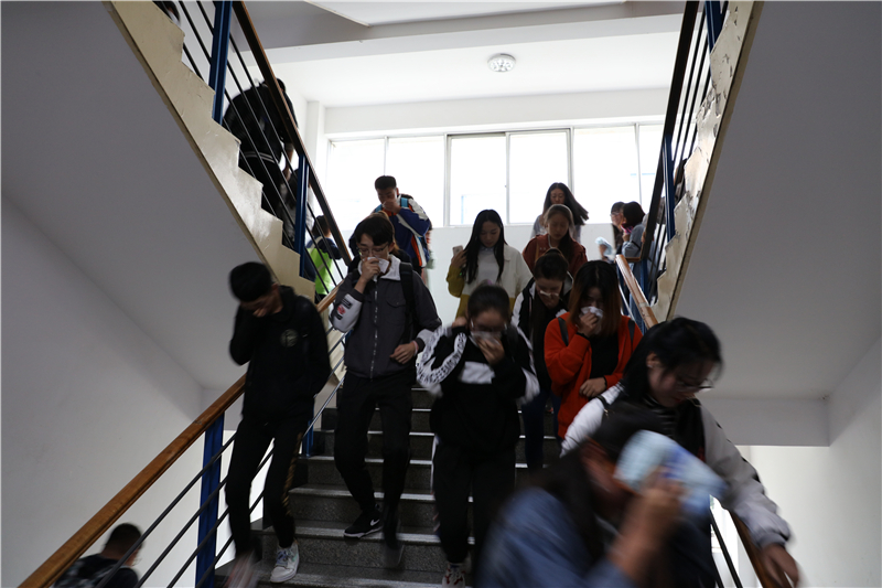 上午10时整,空袭警报鸣响,教学楼和学生宿舍内烟雾迷漫、气味刺鼻,晏家坪街道各社区居民和学院各班学生、教师弯腰用湿毛巾捂口鼻靠楼梯右侧扶手依次有序快速地从教室、办公室撤离到学院足球场疏散掩蔽,到达指定的集合区域,整个疏散过程井然有序。