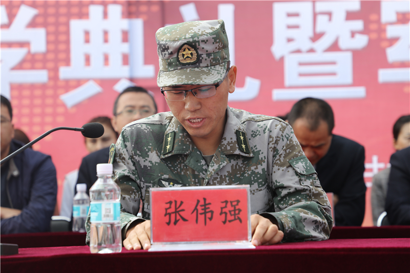 随后,学院领导为2018级新生代表颁发了校徽。学生处处长高忠有宣读了《学院2018级新生军训方案》。通过此次军训,增强学生的国防观念和国家安全意识,培养学生的爱国热情和集体观念,帮助学生树立坚韧不拔的意志和艰苦奋斗的精神。教务处处长李君宏宣读了《关于成立学院2018级新生军训团组编的决定》。党委书记、院长王娟丽为军训团授旗。军训团团长张伟强讲话时表示,为保证训练效果,此次军训精心挑选了军政素质过硬的教官担任,确保在军训中严标准,科学施训,循序渐进,耐心细致。2018级新生代表伍振龙同学代表新生发言时表示,每天进步一小步,人生成功一大步。掌握正确有效的学习方法,自主学习,合作学习,探究学习。培养能力,为终身理想积蓄力量。最后,参加军训的全体学生向军训团团旗宣誓。
