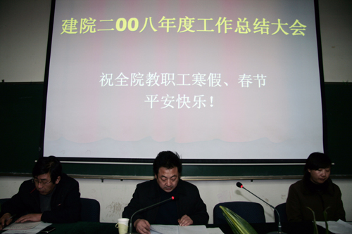 田树涛院长在大会上全面系统地总结了2008年学院的各项工作。一年多来,我院在省建设厅、教育厅的正确指导和大力支持下,高度重视“迎评促建”工作,把“评建”工作列为学院工作的头等大事来抓,自2006年开始落实迎评促建准备工作,围绕“以评促建、以评促改、以评促管、评建结合、重在建设”的评估工作方针,立足学院实际,积极借鉴兄弟院校经验和做法,突出“重在建设”,认真部署和开展“迎评促建”工作。加强领导,建立健全评建工作机构,制定评建方案,加强评建知识学习宣传,认真做好评建任务分解,明确责任、目标和要求,抓好任务落实检查督促。经过一年多梳理总结、查漏补缺、建章立制、自查整改、补充完善等评建阶段性工作,进一步凝练办学指导思想,改善教学条件,提升师资队伍整体素质,深化教学改革,完善教学管理和质量体系,学院各方面工作取得明显成效,使我院人才培养工作总体水平迈上了一个新台阶。