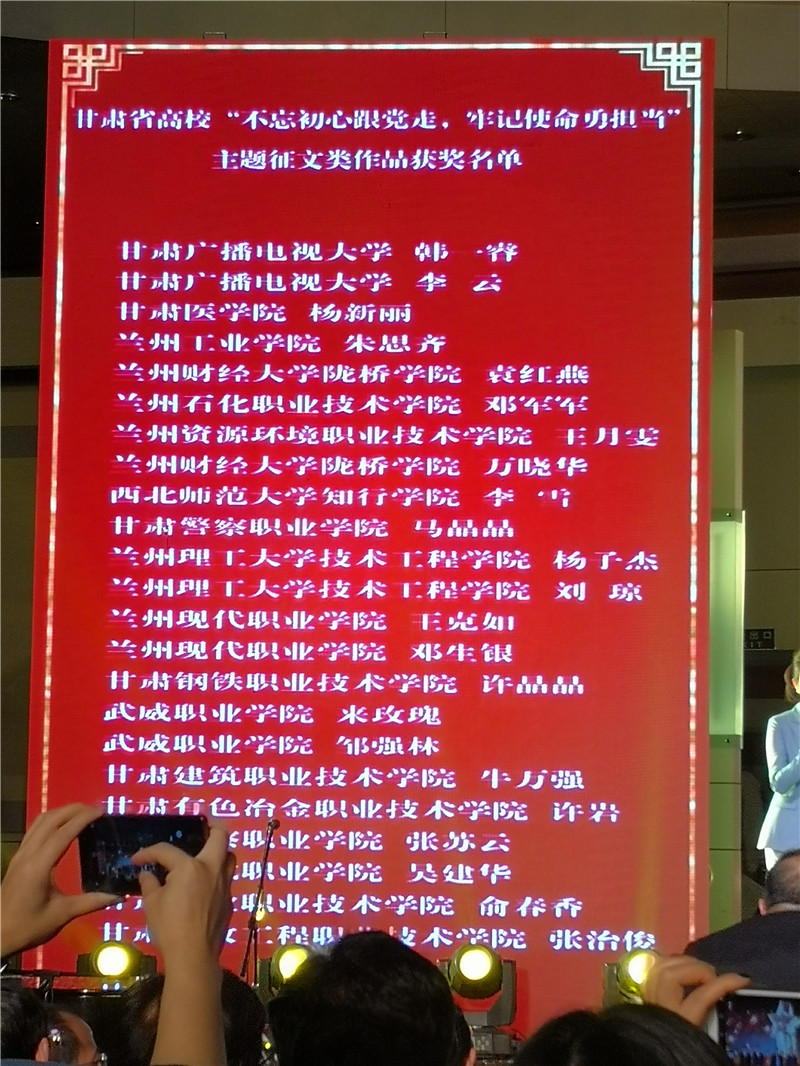 全省高校“不忘初心跟党走,牢记使命勇担当”主题系列活动成果展示暨颁奖仪式于12月29日落幕。甘肃建院在此次活动中,征文比赛、书法比赛、绘画比赛、摄影比赛、微党课竞赛分别获得了好成绩。