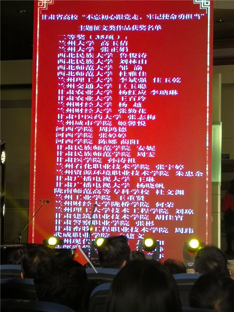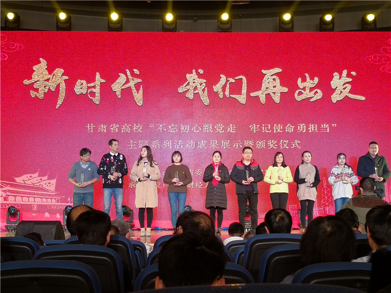 此次活动共有49所高校近5000名师生参与,最终评选出了优秀作品556件,优秀组织织奖15个。经过评选,学院胡佳宵老师的征文《师者担当作为“四季说”-------以李元敏事迹为视角》、张华明老师的摄影作品《扎尕那》分别获得征文比赛和摄影比赛的二等奖;牛万强副书记的征文《筑梦新时代,当好引路人》获得征文比赛三等奖;李君宏处长的书法作品《摘抄习近平讲话》获得书法比赛优秀奖;铁夏琼老师的绘画作品《不忘之心》获得绘画比赛优秀奖;祁巧艳老师和赵蕾蕾老师的摄影作品《流光溢彩》《平凡初心》分别获得摄影比赛三等奖;郭燕花老师的微党课《初心》获得微党课竞赛三等奖。学院获奖代表上台领取了获奖证书。