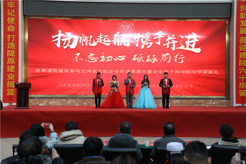 2018年12月29日,建筑系与兰州克力装饰工程有限公司,在学院体育馆二楼共同举办“不忘初心、砥砺前行——校企合作成果展示暨向学院60华诞献礼”活动。