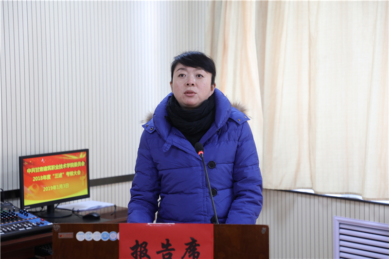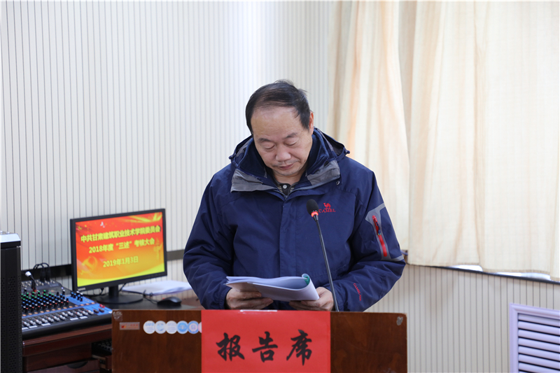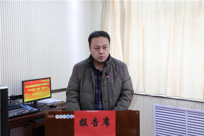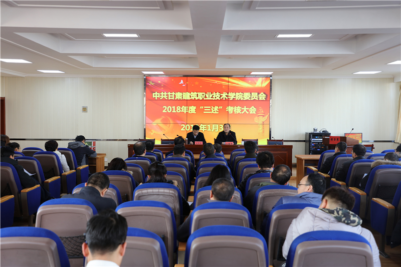 1月3日,中共甘肃建筑职业技术学院委员会召开了2018年“三述”考核大会。10位中层干部在会上做了“三述”报告,学院党委副书记、纪委书记王继伟主持大会,副院长刘亚龙及中层干部和部分教职工代表参加了考核大会。