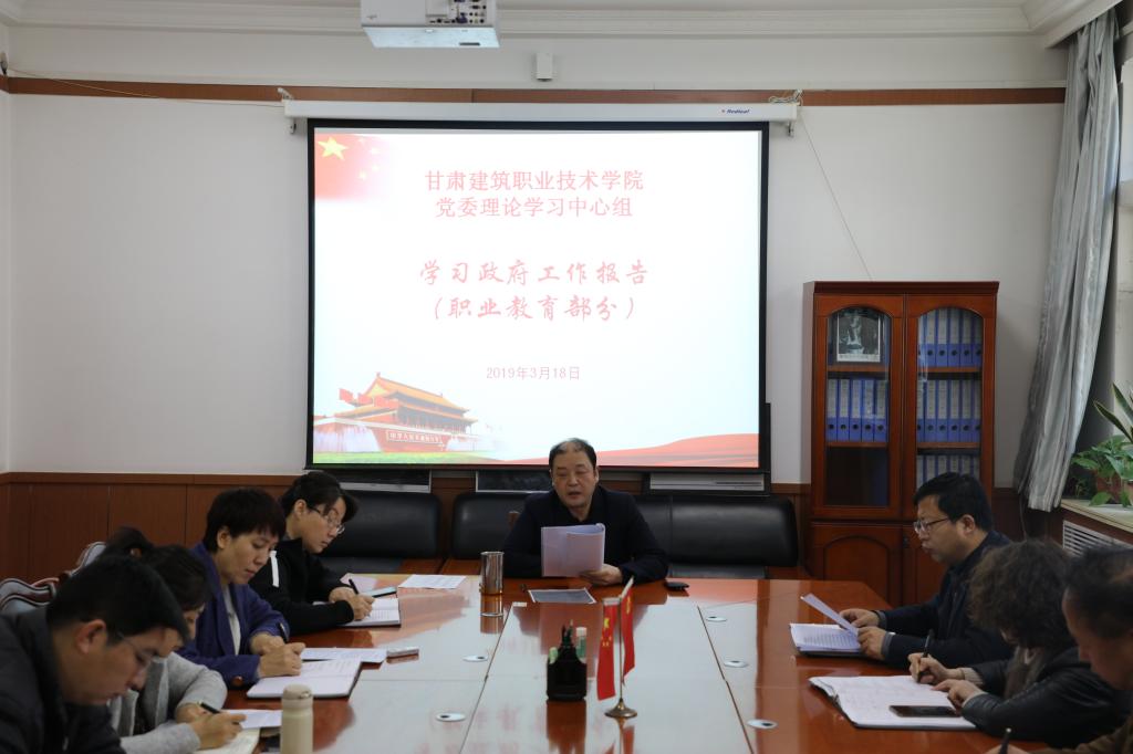 3月18日,甘肃建院党委理论学习中心组学习了《国家职业教育改革实施方案》《习近平参加甘肃代表团审议时的重要讲话》及《政府工作报告》(职业教育部分)的文件精神。学院党委副书记、纪委书记王继伟主持学习。