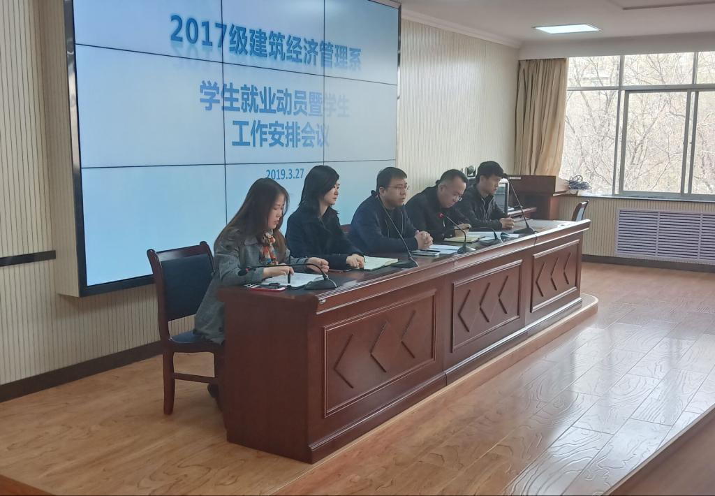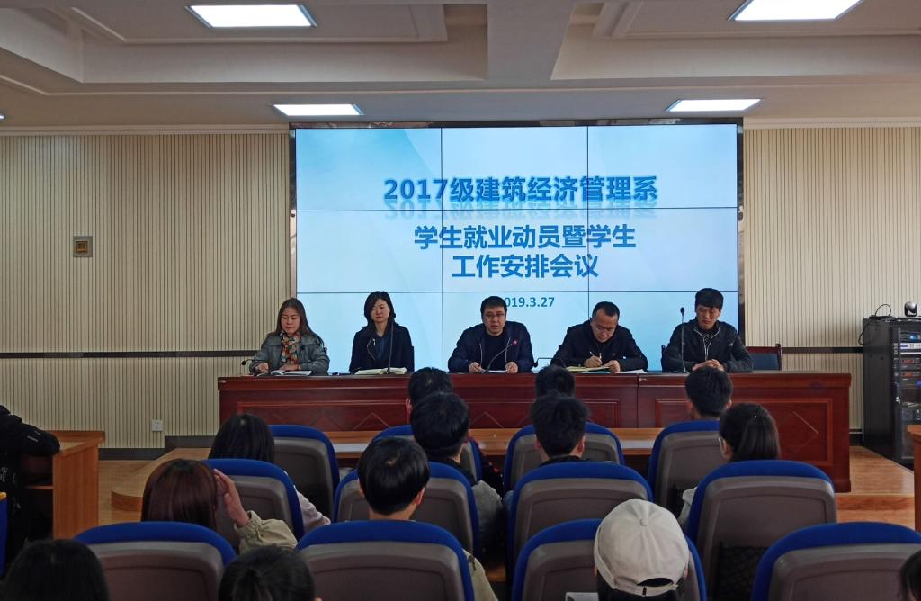 3月27日下午,建筑经济管理系在1号教学楼三楼学术报告厅举行了学生就业动员暨学生工作安排会。就当前学生就业形势及开学来的学生工作展开深入探讨,建筑经济管理系党支部副书记李乐及系上相关老师参加了此次会议。