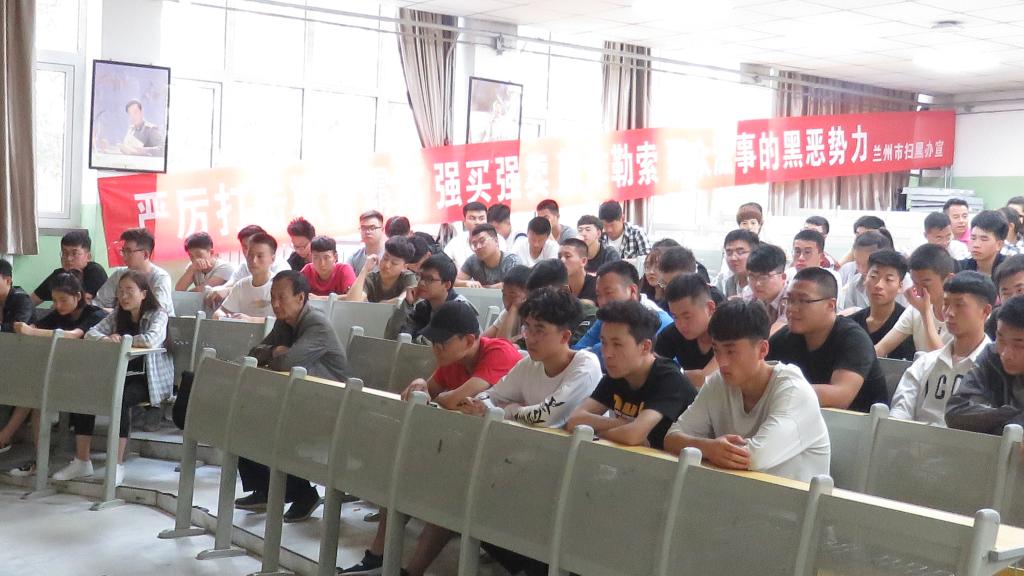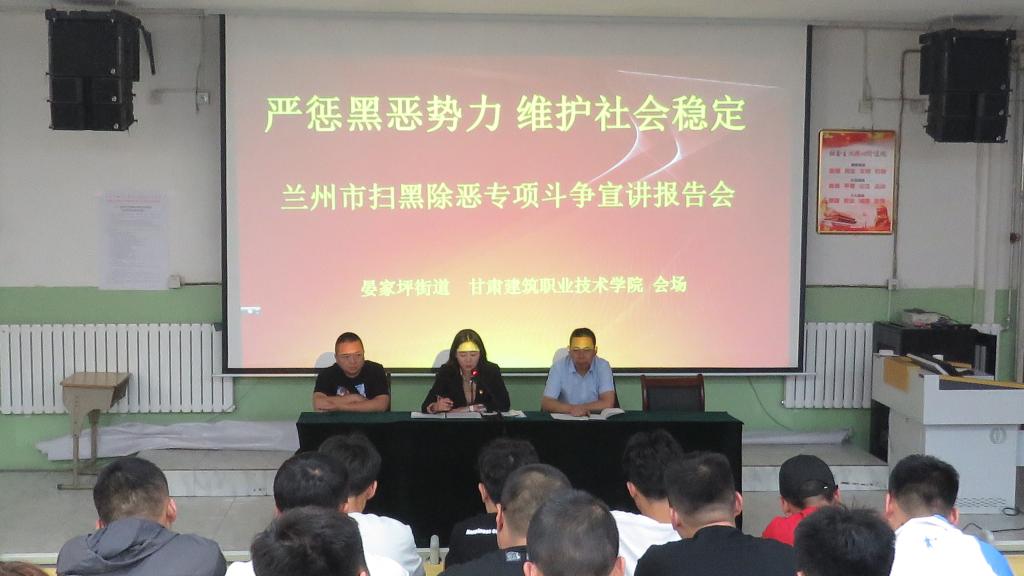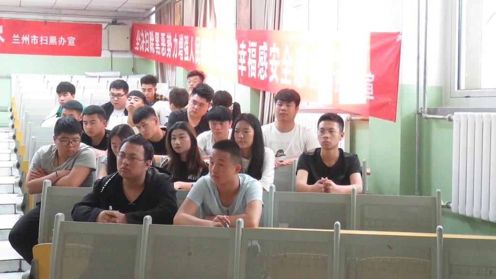 当日下午,学院保卫处、宣传部及社区宣传人员,深入学生宿舍进行了宣传、问卷调查及讲解。随后,邀请了兰州市扫黑除恶宣讲团负责人李琳在晏家坪街道党工委书记杨秉培、晏家坪扫黑除恶专项斗争办公室主任石鑫及成员的陪同下,代表兰州市扫黑除恶专项斗争宣讲团,学院师生代表作了“严惩黑恶势力、维护社会稳定”为主题的报告会。