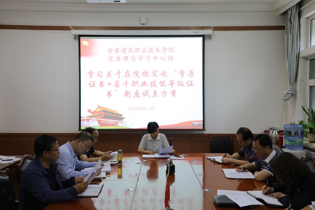 6月17日,甘肃建院党委理论中心组学习了教育部、国家发展改革委、财政部、市场监管总局印发的《关于在院校实施“学历证书+若干职业技能等级证书”制度试点方案》及对其进行解读的答记者问。学院党委委员、党委书记、院长王娟丽同志及中心组成员参加了学习会。