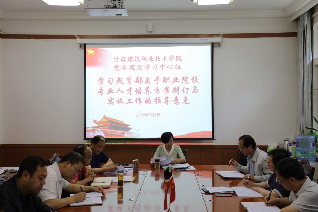 7月7日,甘肃建院党委理论学习中心组学习了《教育部关于职业院校专业人才培养方案制订与实施工作的指导意见》,学院党委委员、党委书记、院长王娟丽同志及领导班子、中心组成员参加了学习,党委委员、党委副书记王继伟主持学习。