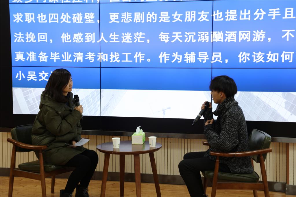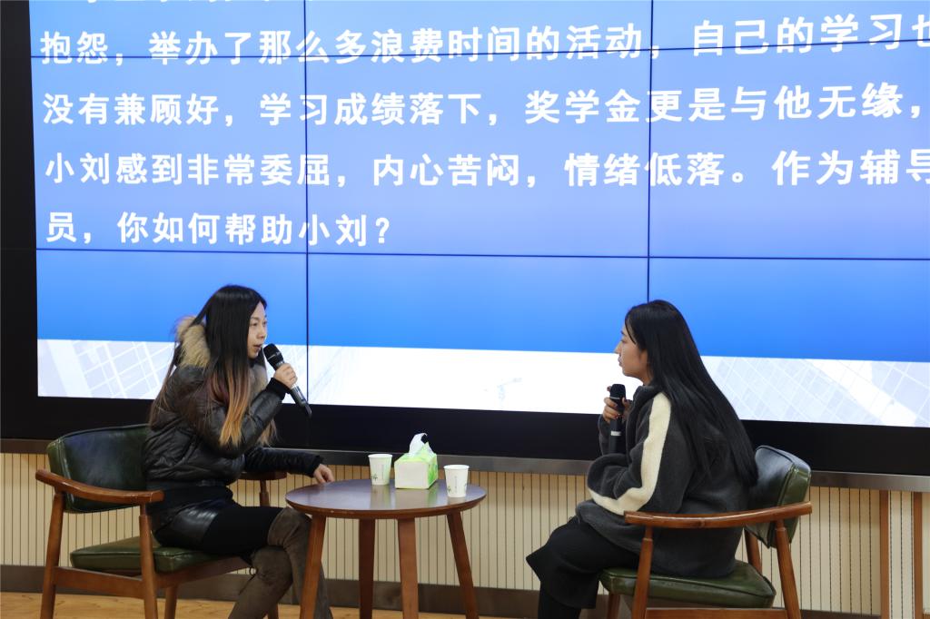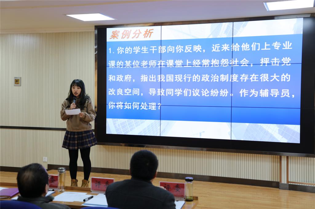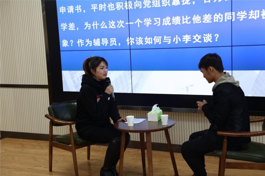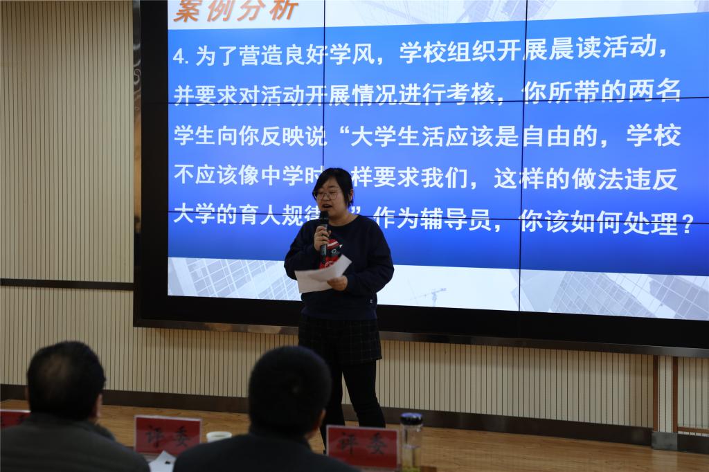 大赛分为两个阶段四个环节,第一阶段项目由笔试(包括基础知识测试、博文写作)和案例分析环节组成,第二阶段项目由谈心谈话和理论宣讲环节组成。其中,第一阶段的笔试考察辅导员对相关理论政策及学生管理知识的掌握程度以及理解分析信息和解决问题的能力,案例分析考察辅导员分析问题、思考问题、研判问题、解决问题以及理论学习应用能力。全体一线专职辅导员、学生干事共计30余人参加了第一环节的笔试,成绩前15名的选手晋级案例分析环节比赛;前两个环节总成绩前10名的选手晋级第二阶段的比赛。第二阶段的谈心谈话考察辅导员对相关理论政策、学生特征、学生成长成才规律的了解把握及对问题的解决能力和对学生的教育引导能力,理论宣讲环节注重考察宣讲的政治性、思想性、理论性、政策性、导向性。