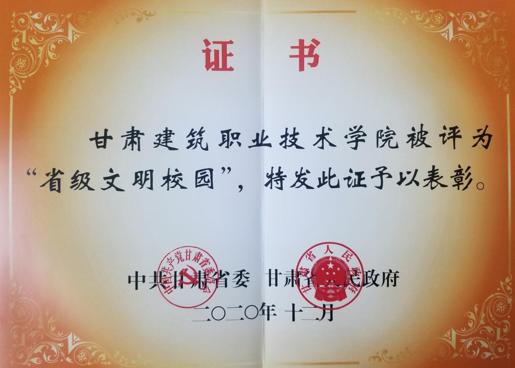 中共甘肃省委、甘肃省人民政府授予甘肃建筑职业技术学院“省级文明校园”荣誉称号 日期:2020-12-25 来源: 12月22日,中共甘肃省委、甘肃省人民政府命名表彰第十五批省级精神文明建设先进集体、先进工作者及第二届省级文明校园等。甘肃建筑职业技术学院被授予第二届“省级文明校园”荣誉称号。