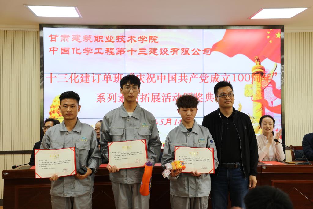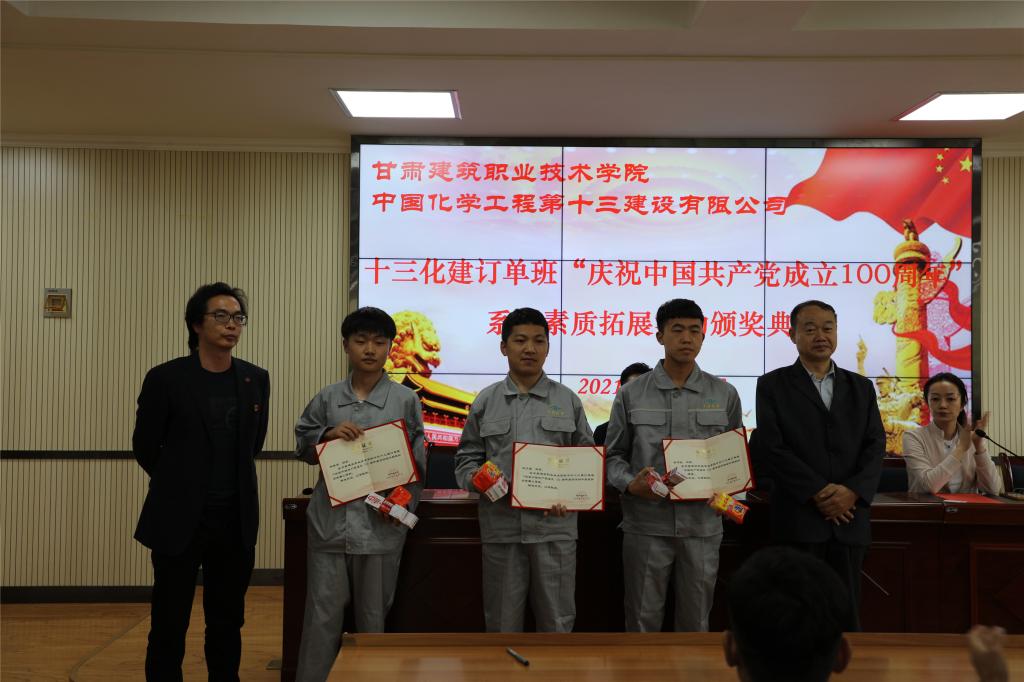 2021年5月14日,学院十三化建订单班“庆祝中国共产党成立100周年”系列学生素质拓展活动颁奖典礼在学院校本部2号教学楼三楼学术报告厅举行。订单企业中国化学工程第十三建设有限公司党委组织部部长、人力资源部主任、高级经济师刘美双、学院招就处副处长吴沛晟、建工系主任李维敦、环工系主任邱琴忠、党总支书记王亮、2019级订单班班主任及全体学生参加,典礼由建工系就业干事朱玉平主持。