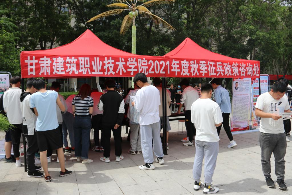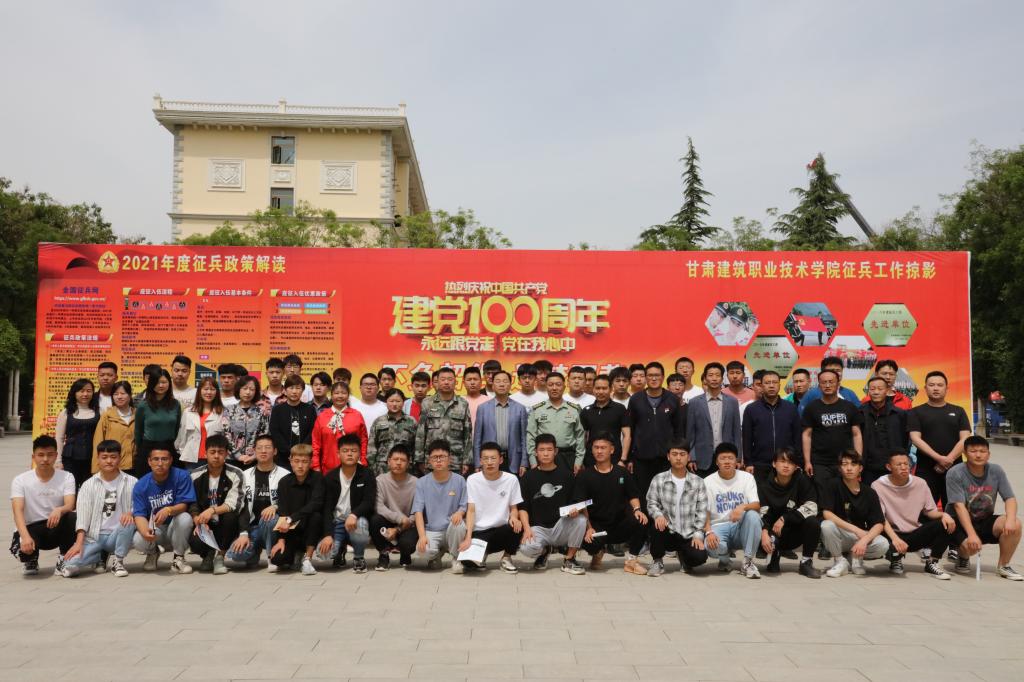 会后,与会领导与参会师生在学院2021年秋季征兵宣传展板下合影留念。