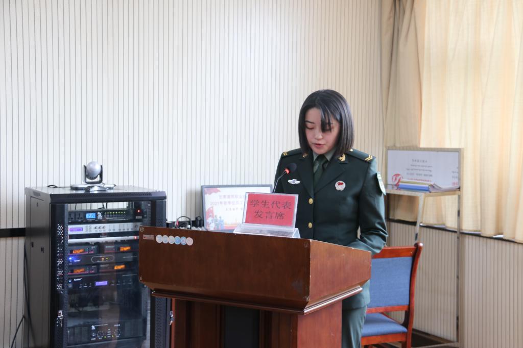 优秀退役复学大学生代表2020级建筑工程技术5班孙一凡同学用“甘做胡杨淡看大漠孤烟”、“砥砺初心不坠凌云之志”、“继续前进续写无悔青春”三句话分享了自己携笔从戎,扎根大漠,建功立业的从军经历及成长之路;随后,2021年秋季应征报名大学生代表2020级计算机5班戴炜宸同学向全院青年学子发出倡议,倡议大家响应国家号召、走进军营、携笔从戎、建功立业。