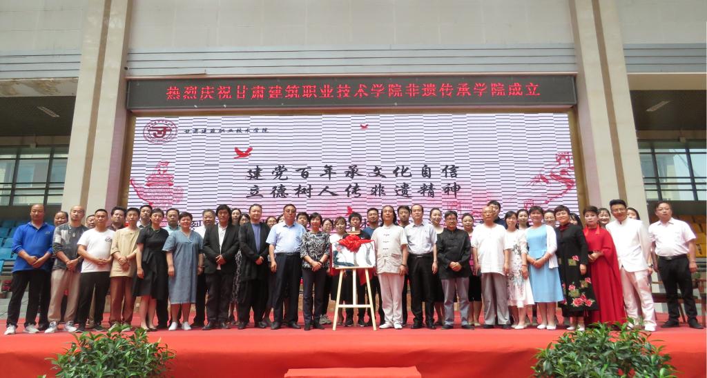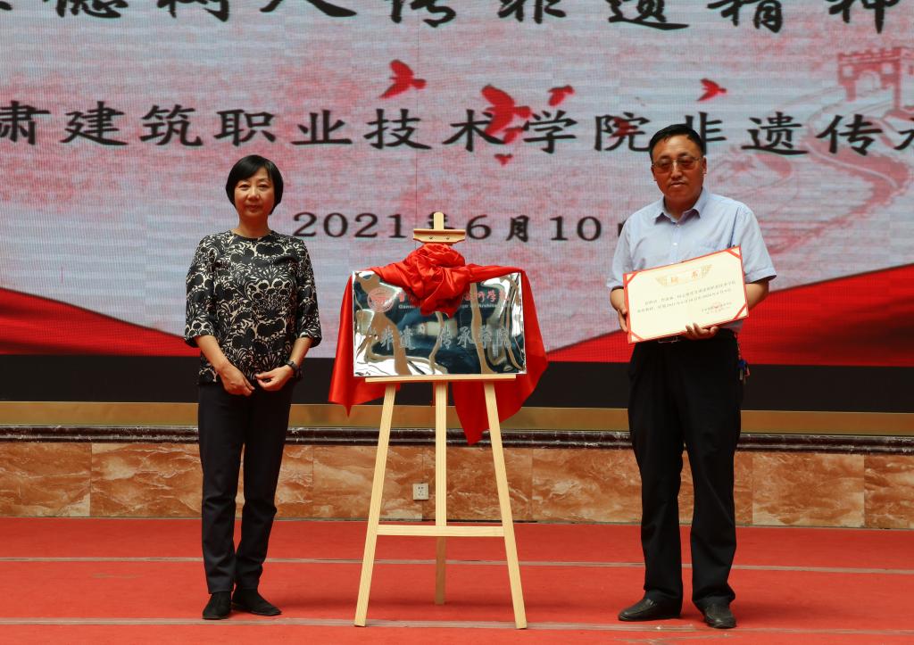 建党百年承文化自信,立德树人传非遗精神!6月10日,伴随着中国民间文艺家协会会员田野、甘肃省民间文艺家协会会员司马和曙带来的高亢、悠长、爽朗,彰显民族风格和地方特色的“花儿”精彩演唱下,甘肃建筑职业技术学院非遗传承学院成立仪式拉开序幕。甘肃省工艺美术大师、副高级雕塑艺术师常天平,敦煌壁画研究专家吴荣鉴,甘肃省高级葫芦雕刻艺术师白正兵等22名“非遗”传承人,学院党委书记、院长王娟丽,党委委员、副院长李君宏,建筑系主任杨晶等师生参加成立仪式,仪式由建筑系党总支书记蔡萍主持。